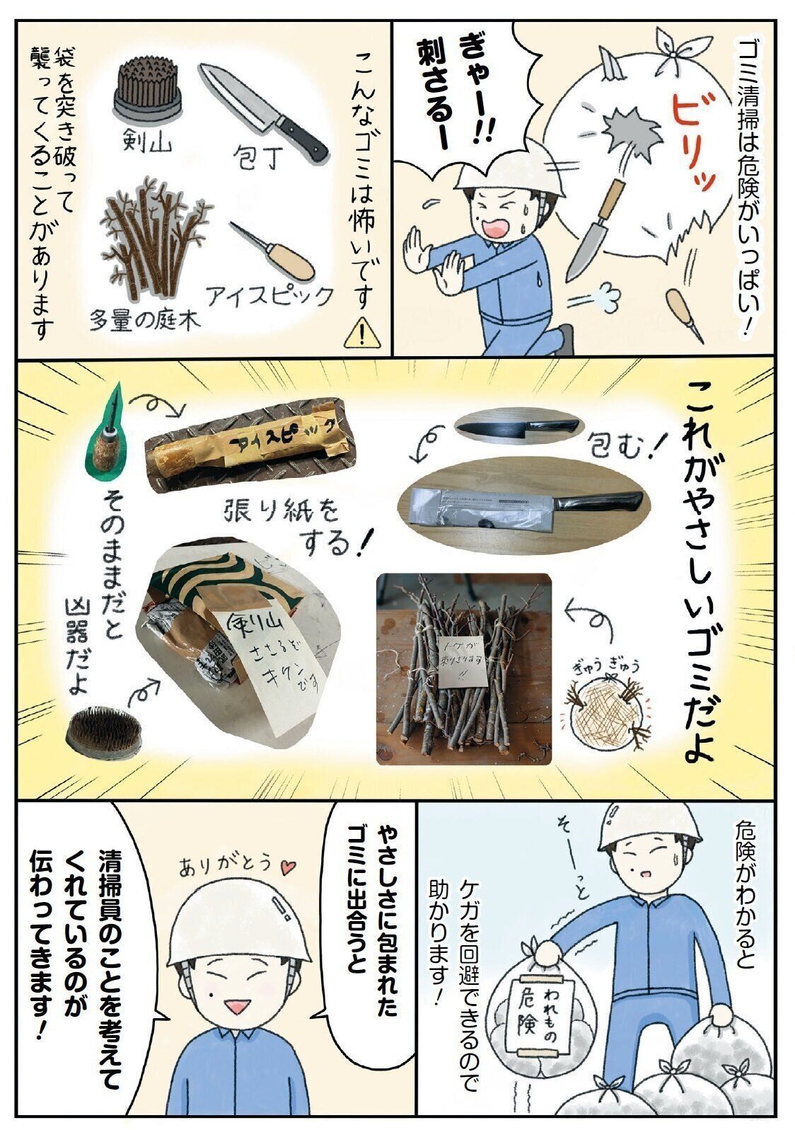 だから「危ない!」って注意喚起してくれてるゴミや、刃や尖ったところをぐるぐる巻きにしてくれているゴミはありがたい。1日に10~12トンのゴミを回収してますが、こんな「回収する人間にやさしいゴミ」は、しっかり心に刻まれているんですよねー。