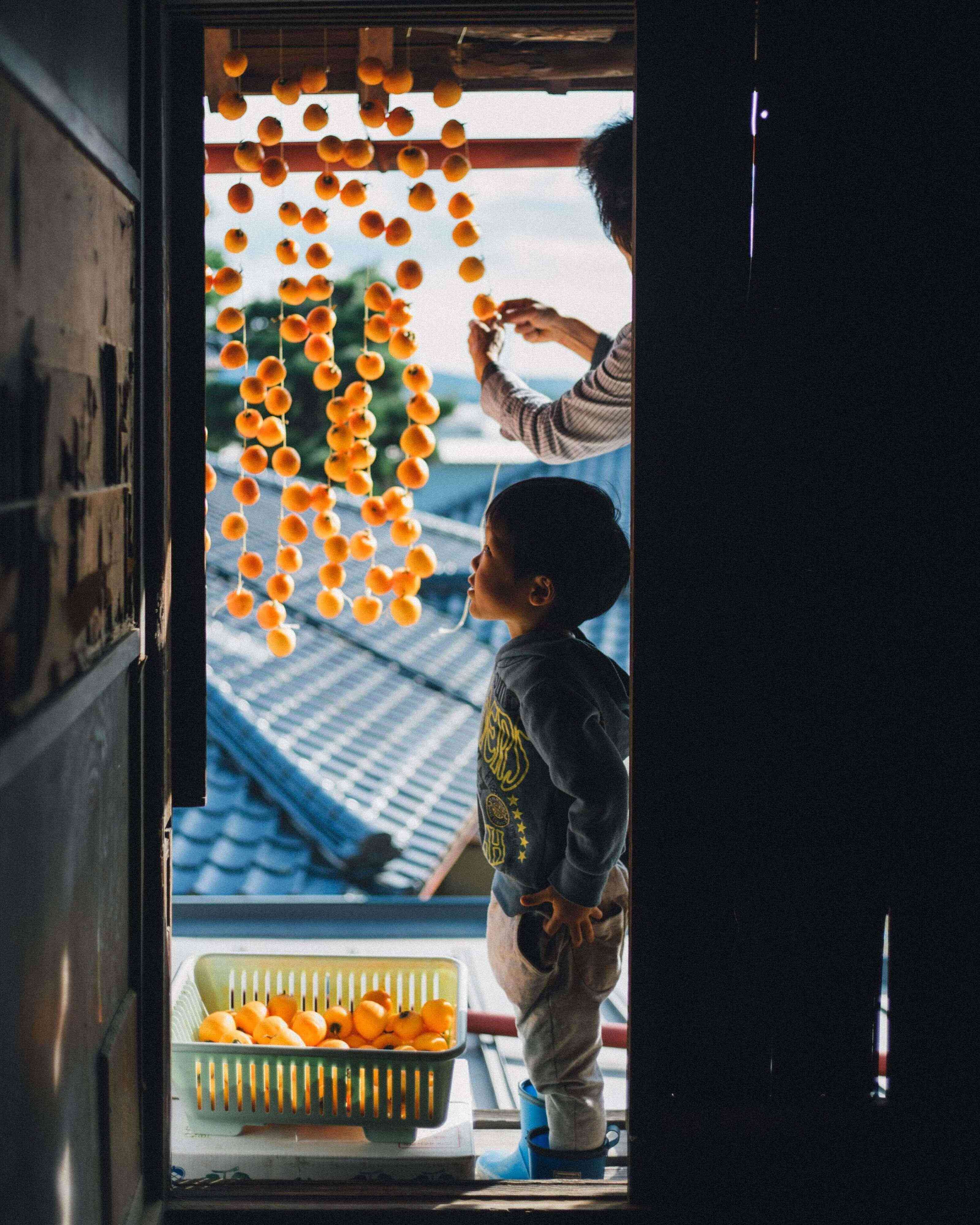 3枚目は寒い時期。軒下に干されたばかりの干し柿を眺める長男くんです。