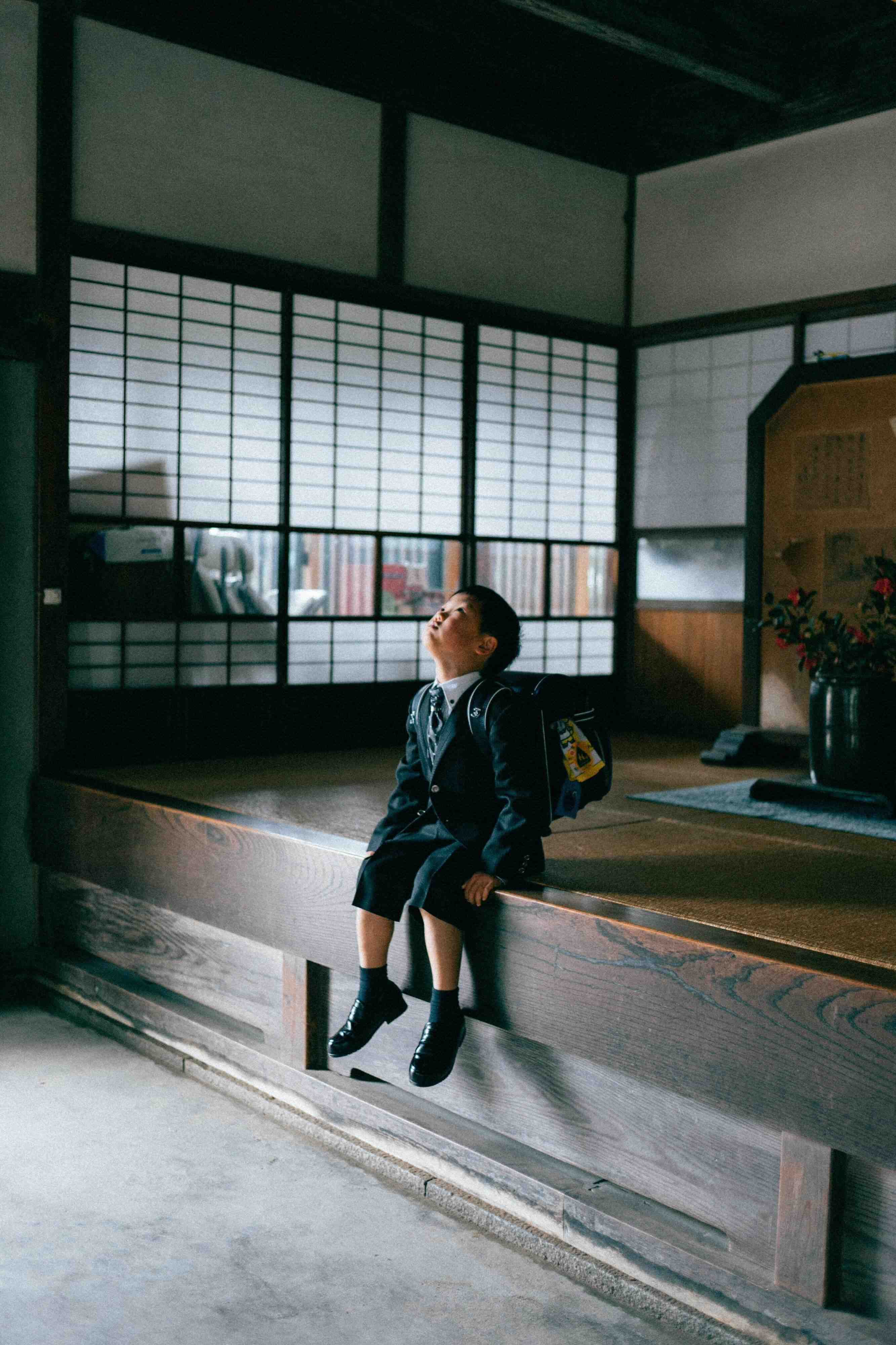 そして4枚目には、ランドセルを背負って天井を見上げる長男くんの姿が。スーツに身を包んで、これから入学式へ行くのでしょうか。