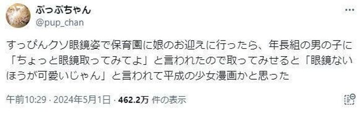 ぷっぷちゃんさん(@pup_chan)が娘さんの保育園で出会った年長組の男の子。「ちょっと眼鏡取ってみてよ」と言われるまま、ぷっぷちゃんさんがその通りにすると、返ってきたのは15万人がキュンとする決めゼリフでした。お話をうかがいます。