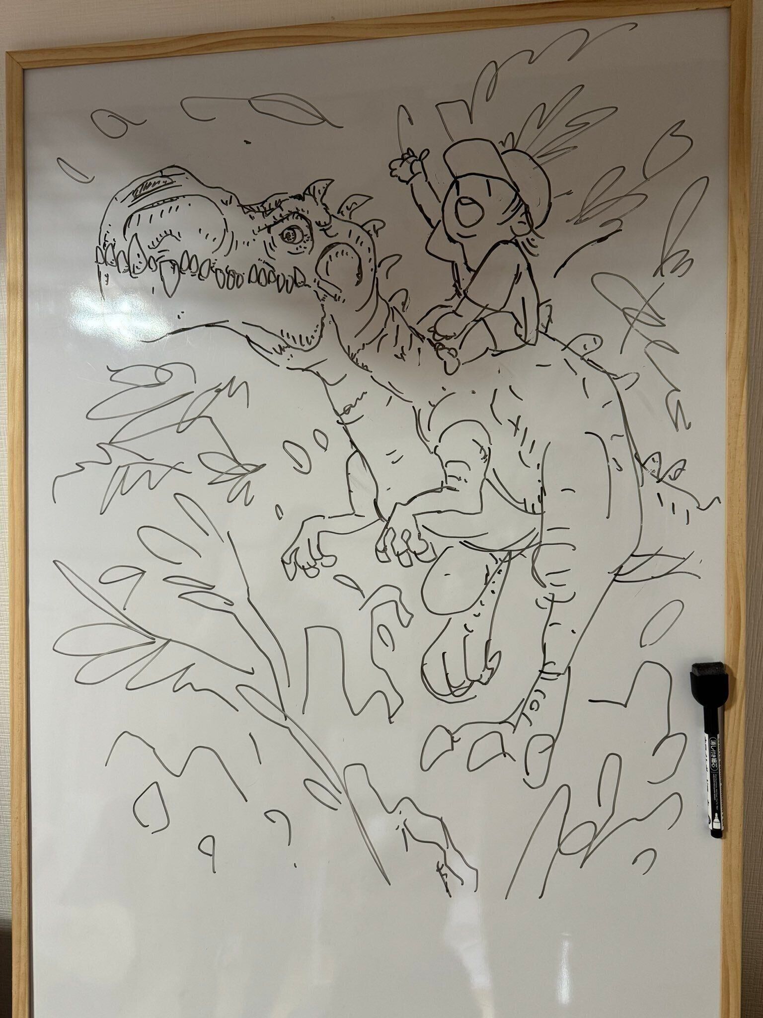 “落書き”の内容は、恐竜アニメに登場するひと際大きな恐竜とその背中にまたがる息子さん。恐竜はティラノサウルスやギガノトサウルスをモデルにしたような、鋭い歯が並ぶ大きな口に二足歩行という姿をしています。