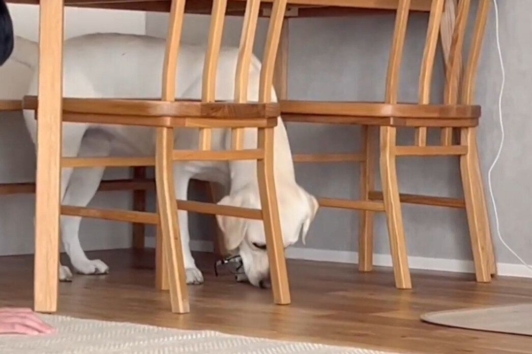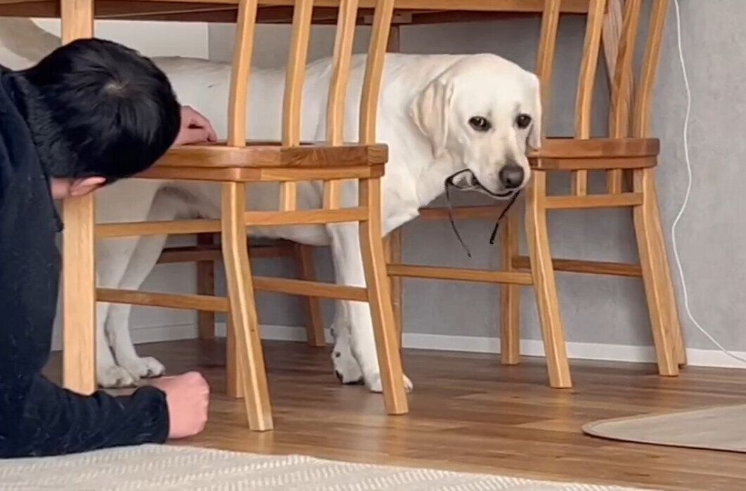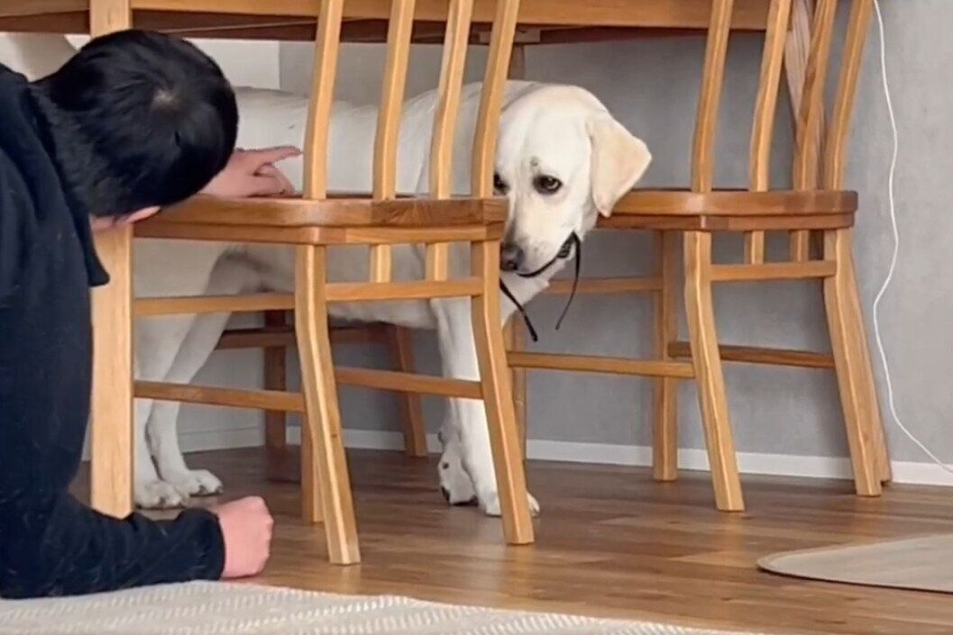 「夫が必死に説得してた。」と投稿された動画には、パパの大切なものを口にくわえてテーブルの下に立てこもる、れもんちゃんの姿が映っていました。