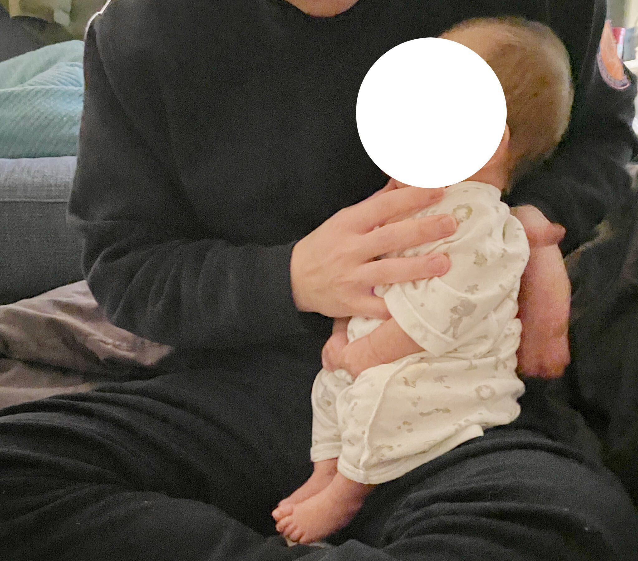 run1yさんが「ゲップ出しの姿勢があまりにも良すぎて一生笑ってる」と投稿したのは、生後2カ月だったころの息子さんの写真。パパの膝の上に座るような体勢で、息子さんの体を支えながら背中をやさしくトントンする様子が伝わってきます。