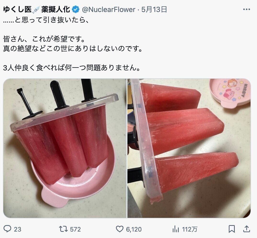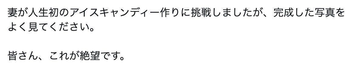 ゆくし医 薬擬人化さん(@NuclearFlower)の妻が、人生初のアイスキャンディー作りに挑戦しましたが、とあるミスで失敗。できあがった写真をXに投稿したところ、「絶望まで味わえるアイス」といったコメントが集まり話題になりました。