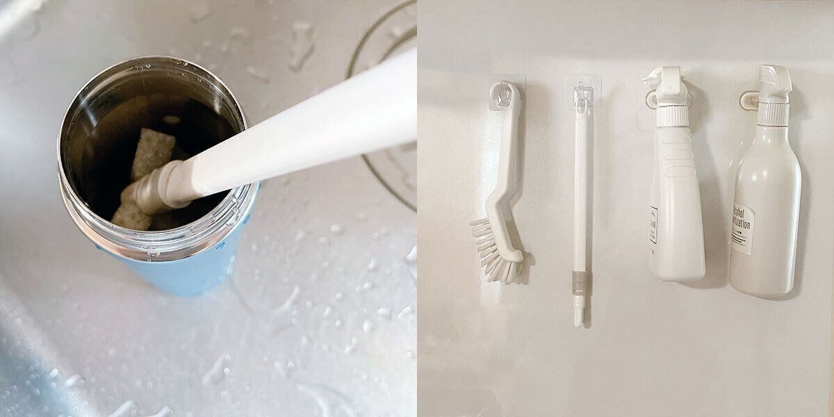 今までもボトルや深いグラスを洗う柄つきスポンジはありましたが、スポンジを交換できなかったり、見た目もすっきりしなかったり、置いておくとスポンジから水が落ちたりして、あまり使いたくないなと感じていました。
