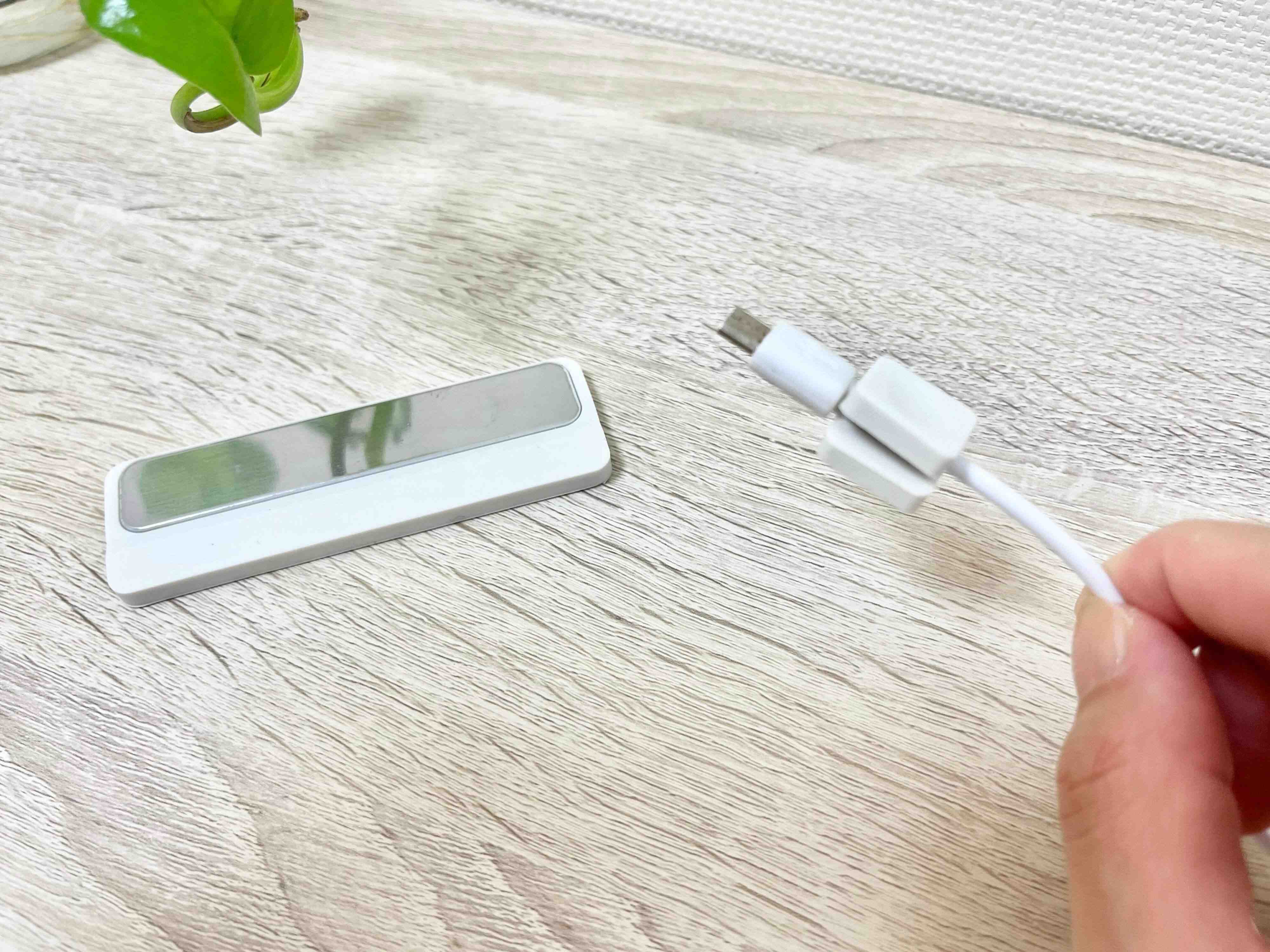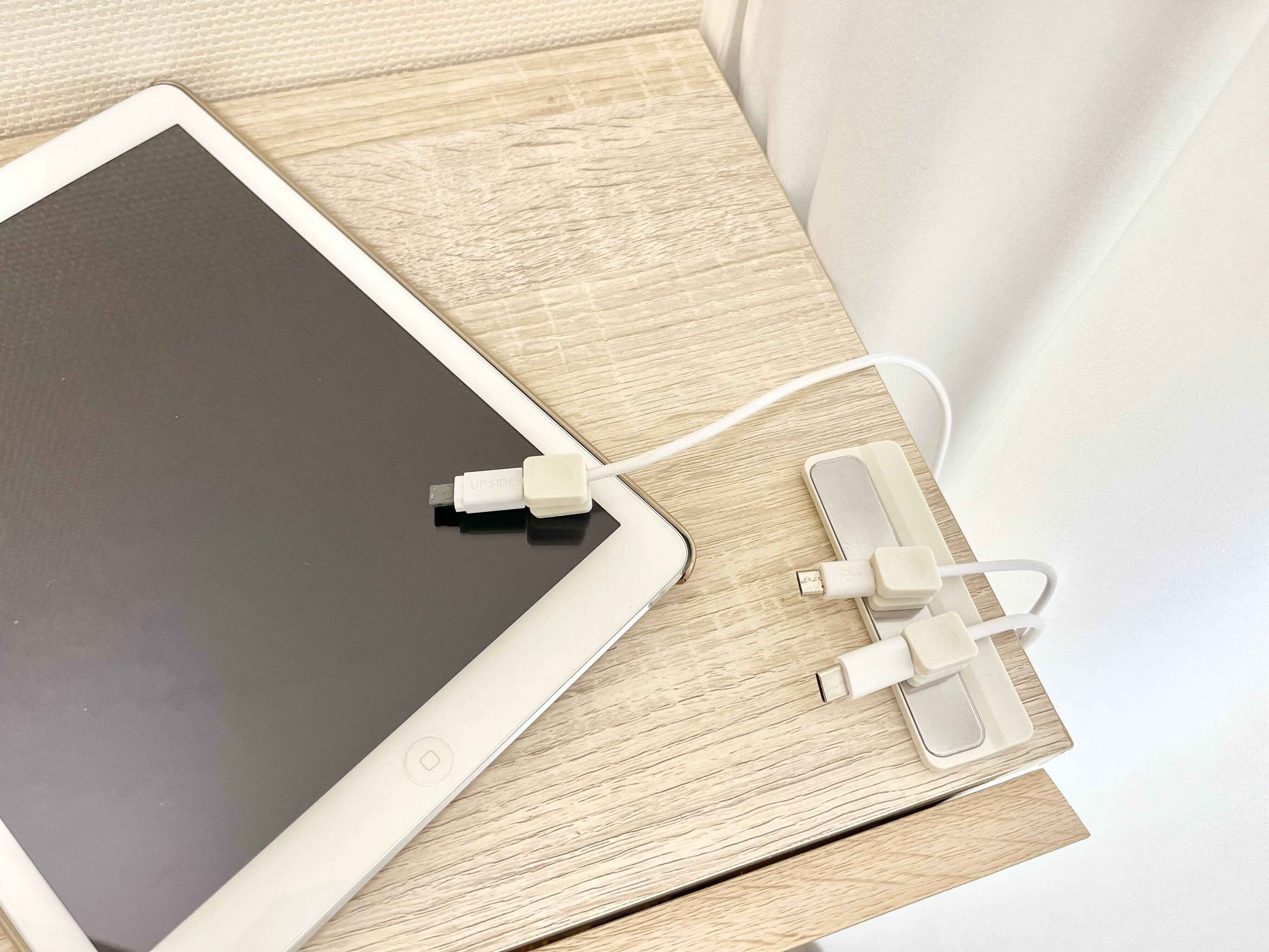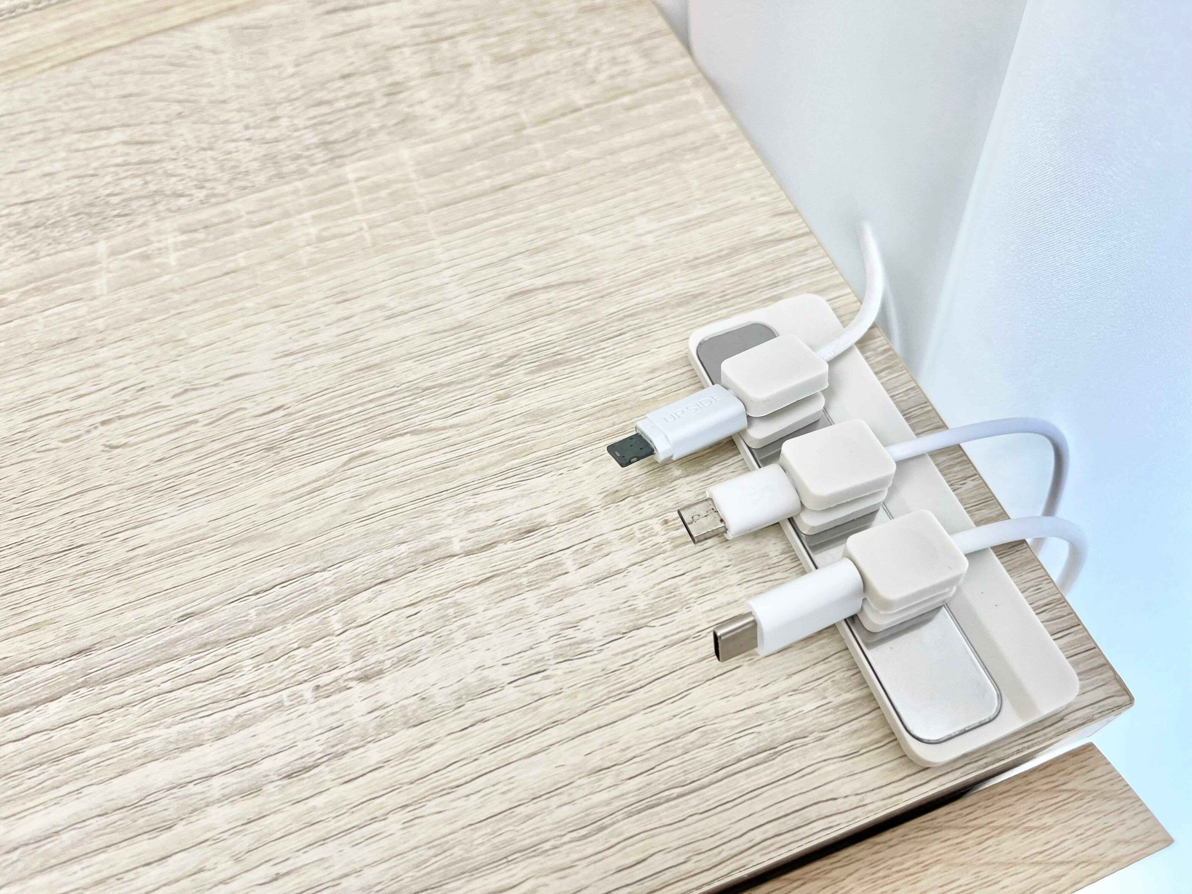 あとは台座のマグネットにピタッとくっつけるだけです。これで充電ケーブルがダラーンと垂れ下がってしまったり、バラバラに散らばってしまったりすることなく、1カ所にスッキリまとめて整理整頓することができます。