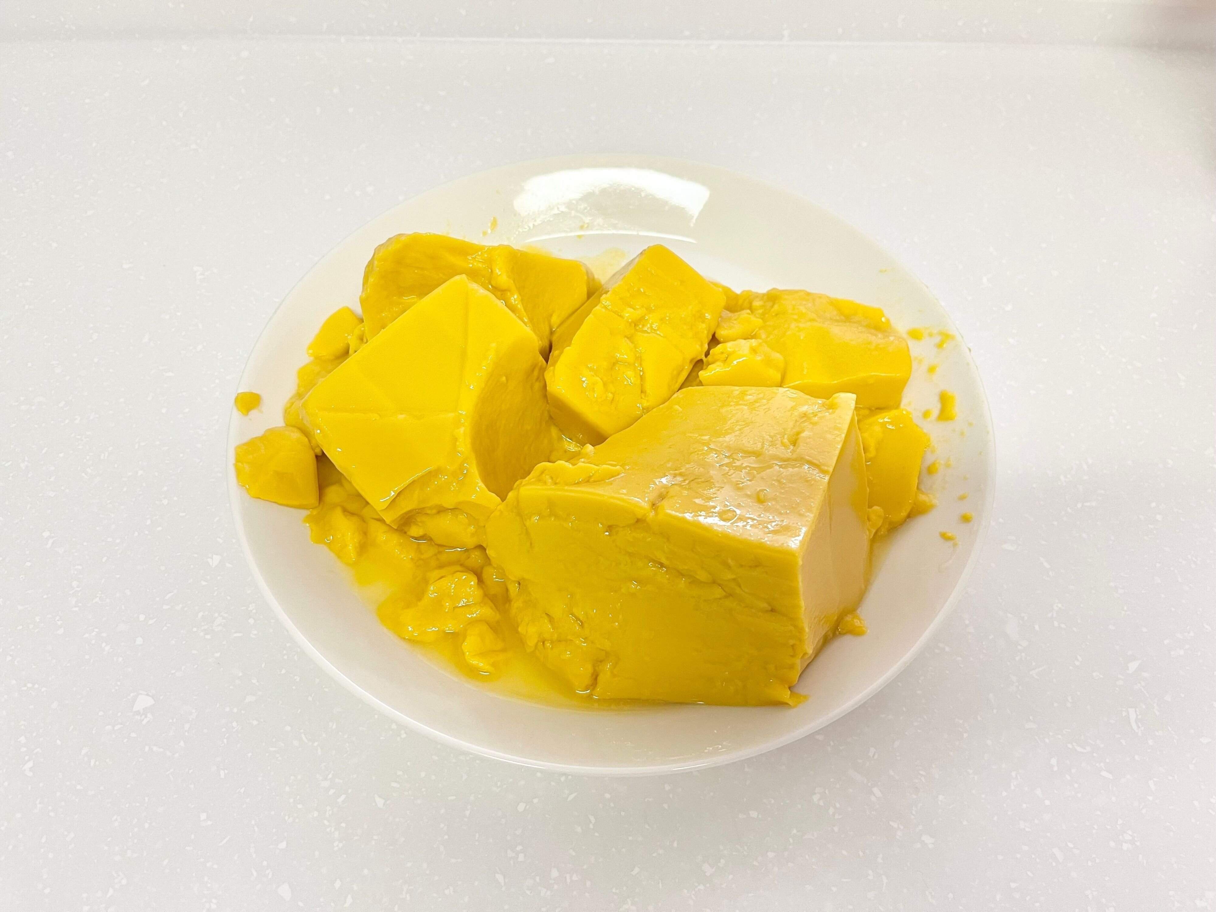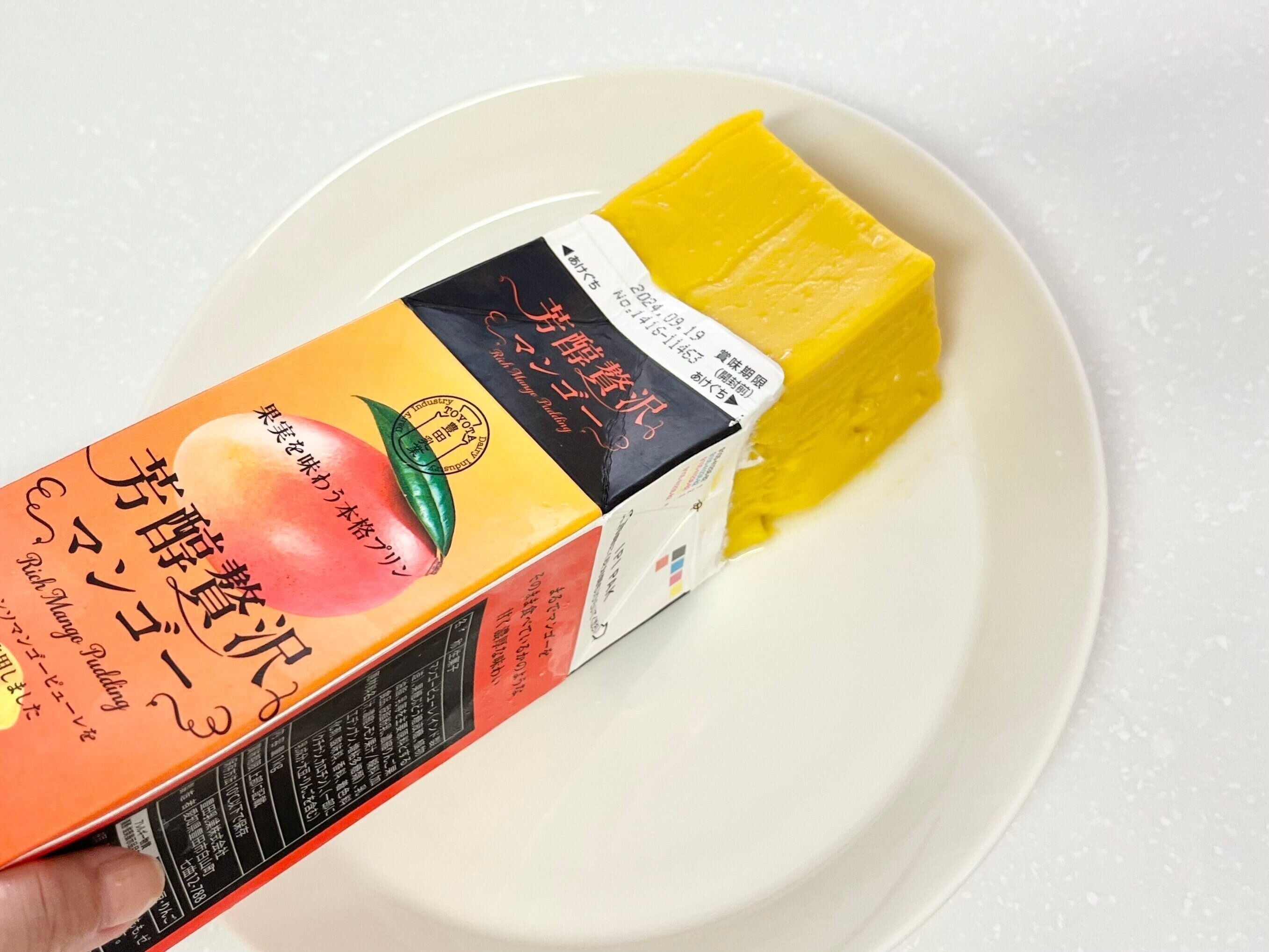 牛乳パックデザートはキレイに取り出せたときはとってもうれしいんですが、たまに取り出すのに失敗してくずれてしまうこともあります。とくにこちらの「芳醇贅沢マンゴー」は、ほかの牛乳パックデザートと比べても少し柔らかくて取り出しにくい印象を受けました。