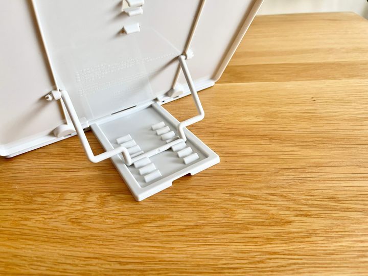 商品の手前側には2本の脚のようなものがあり、この脚のようなもので本やタブレットなどを挟み込み、ページがめくれるのを防ぎます。厚み調節も可能で、薄いノートから辞書などの厚みのある本まで幅広く対応しています。