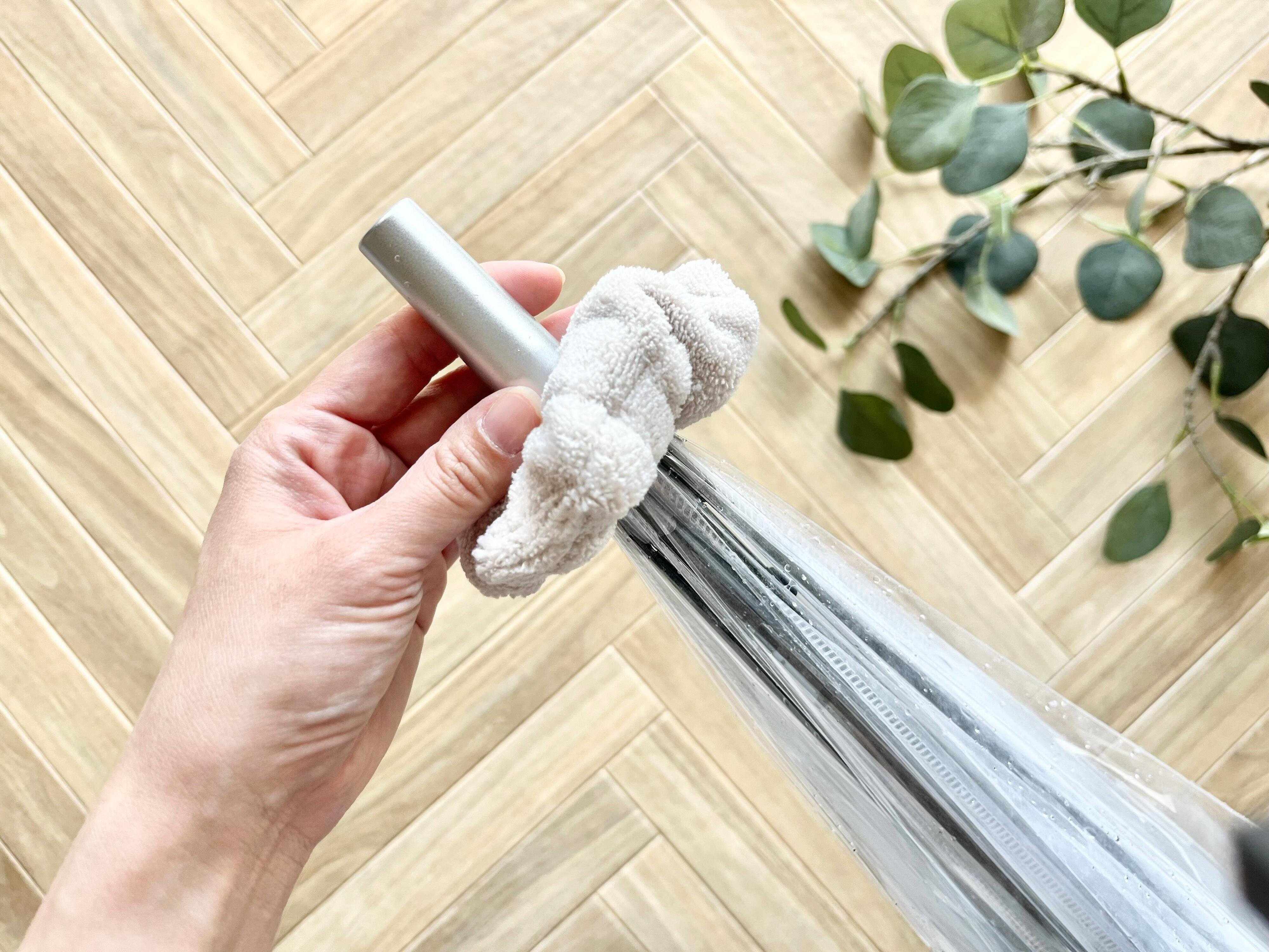 そして傘をクルクルと回しながら持ち手の方に向かって商品を移動させていき、水滴を拭いていくだけでOK!