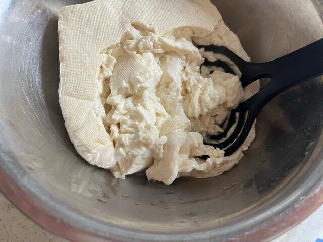 木綿豆腐の水をしっかり切り、細かく潰します。
