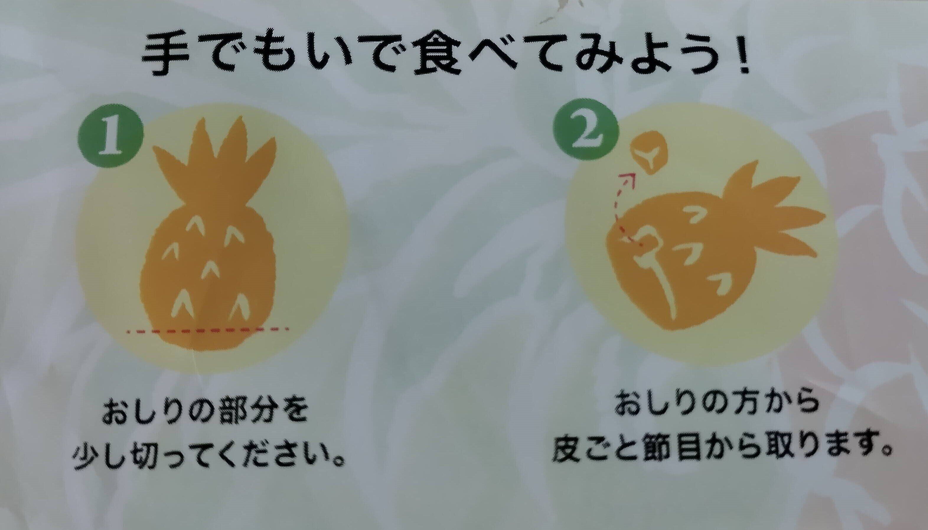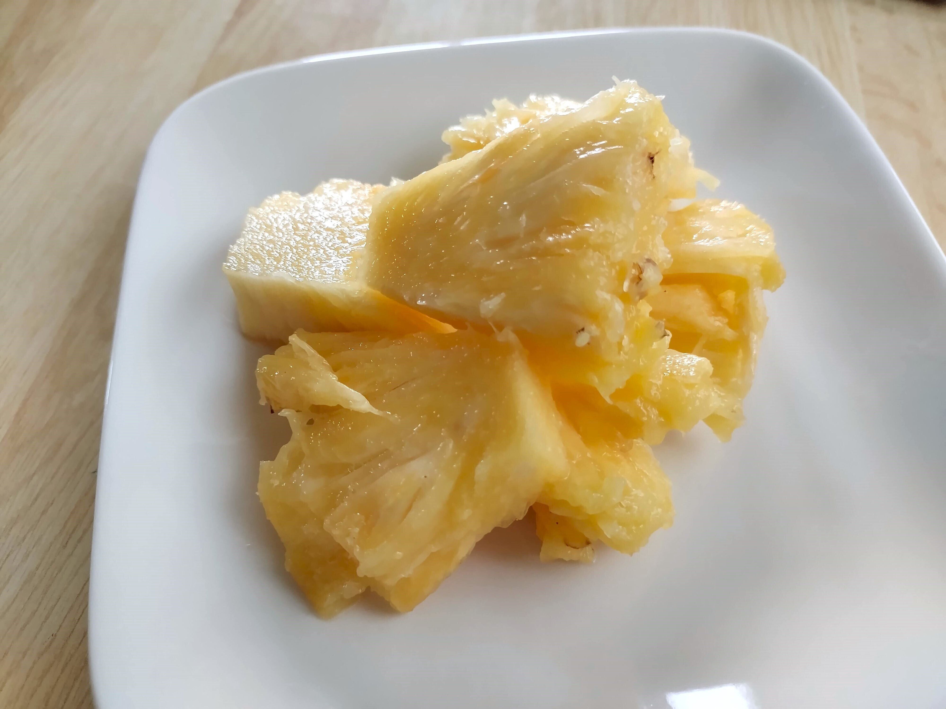 はじめは袋に書いてあるとおり、手でちぎって食べていました。しかし3歳の娘がうまくちぎれなかったので、途中から普通のパインと同様に皮を切り落として、一口サイズに切って食べることにしました。