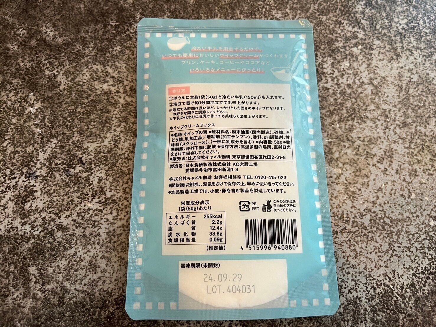 KALDIのホイップクリームミックスは、粉末状で保存期間も長め。