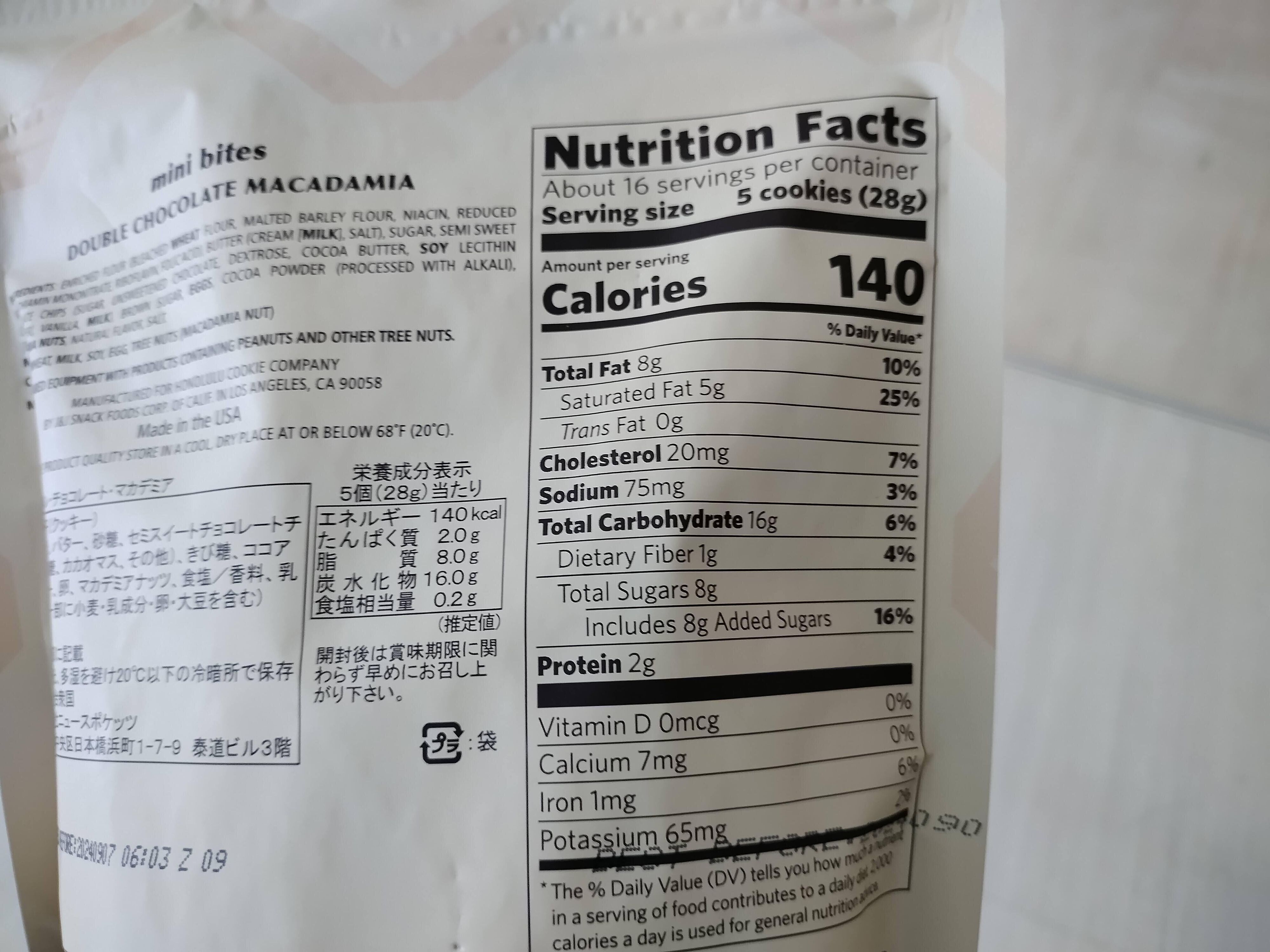 「ホノルルクッキーミニバイツダブルチョコレートマカダミア」の価格は、454g入りで税込1,628円でした(※2024年6月筆者購入時)。重さが5個で28gとのことですので、1つ5.6gとすると、80個以上入っているという計算になります。