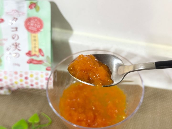 ジュレの色はクコの実特有の鮮やかなオレンジ色。原材料にこんにゃく粉、寒天が使われているのでプリッとした食感ですがつるんとのどごしが良く食べやすいです。味はほんのりとした甘さ、クコの実は乾燥のものをもどしてそのままたくさん食べると少しクセがあるのですが、それもなく食べやすかったです。クコの実はスーパーフードとして人気の食材なので手軽に食べられるジュレタイプは気に入りました。これからの時季、冷やしてもさっぱりと食べることができます。