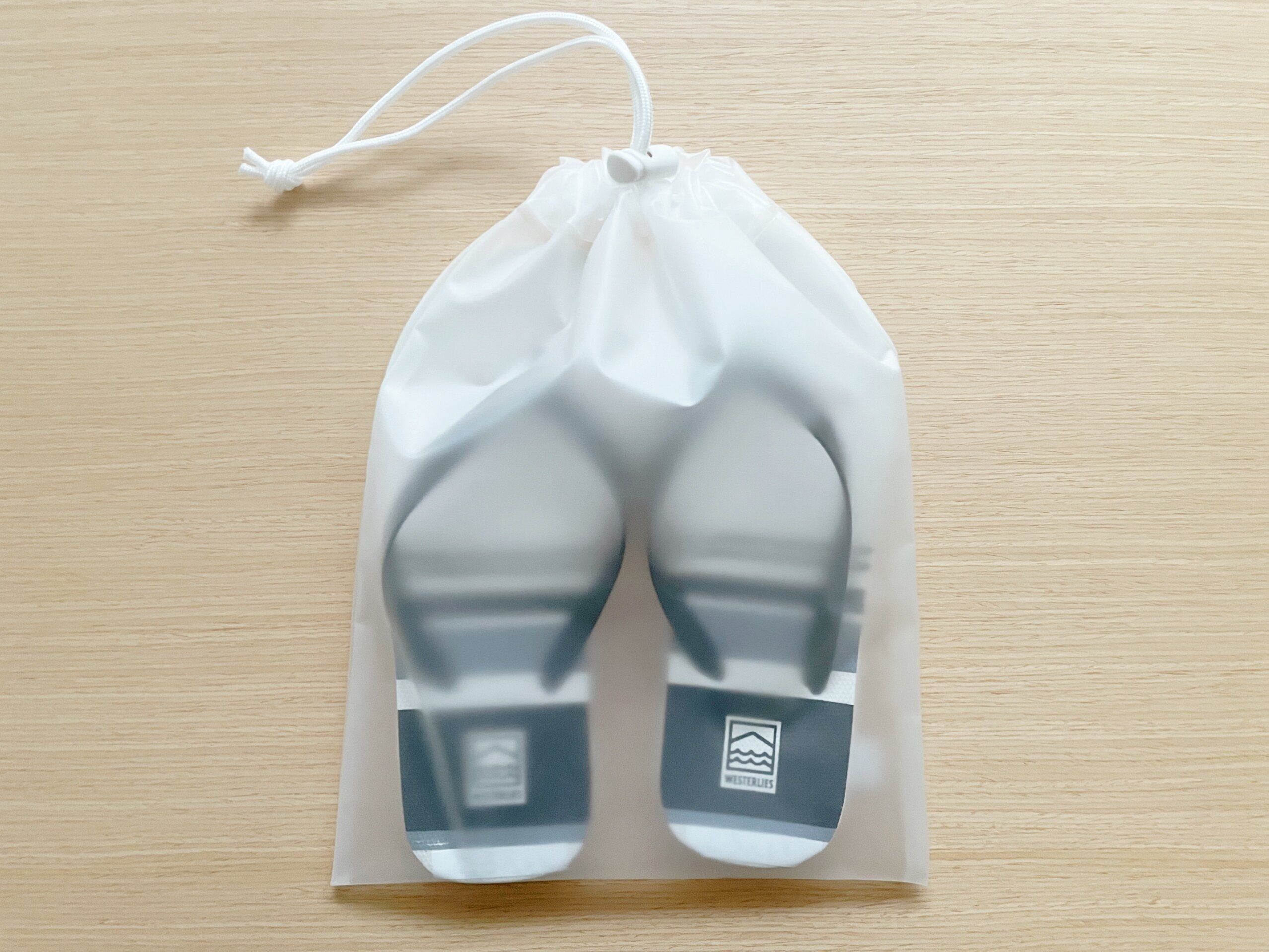 Sサイズは小学1年生の長男のサンダル入れとして購入しました。サンダルは水泳の授業の持ち物で、最初はビニール袋に入れていましたが、見栄えが良くなく中に何が入っているのか見えないのが心配の種に。21cmのサンダルはSサイズの巾着にスッキリ収まって、何が入っているのが見えるので安心です。