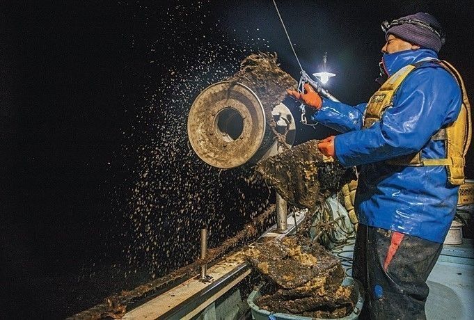 ▲仕事は夜明け前から始まる。作業の多くは船上で。強風が吹き荒れ、激しく波立つ沖合での作業は危険をともなう