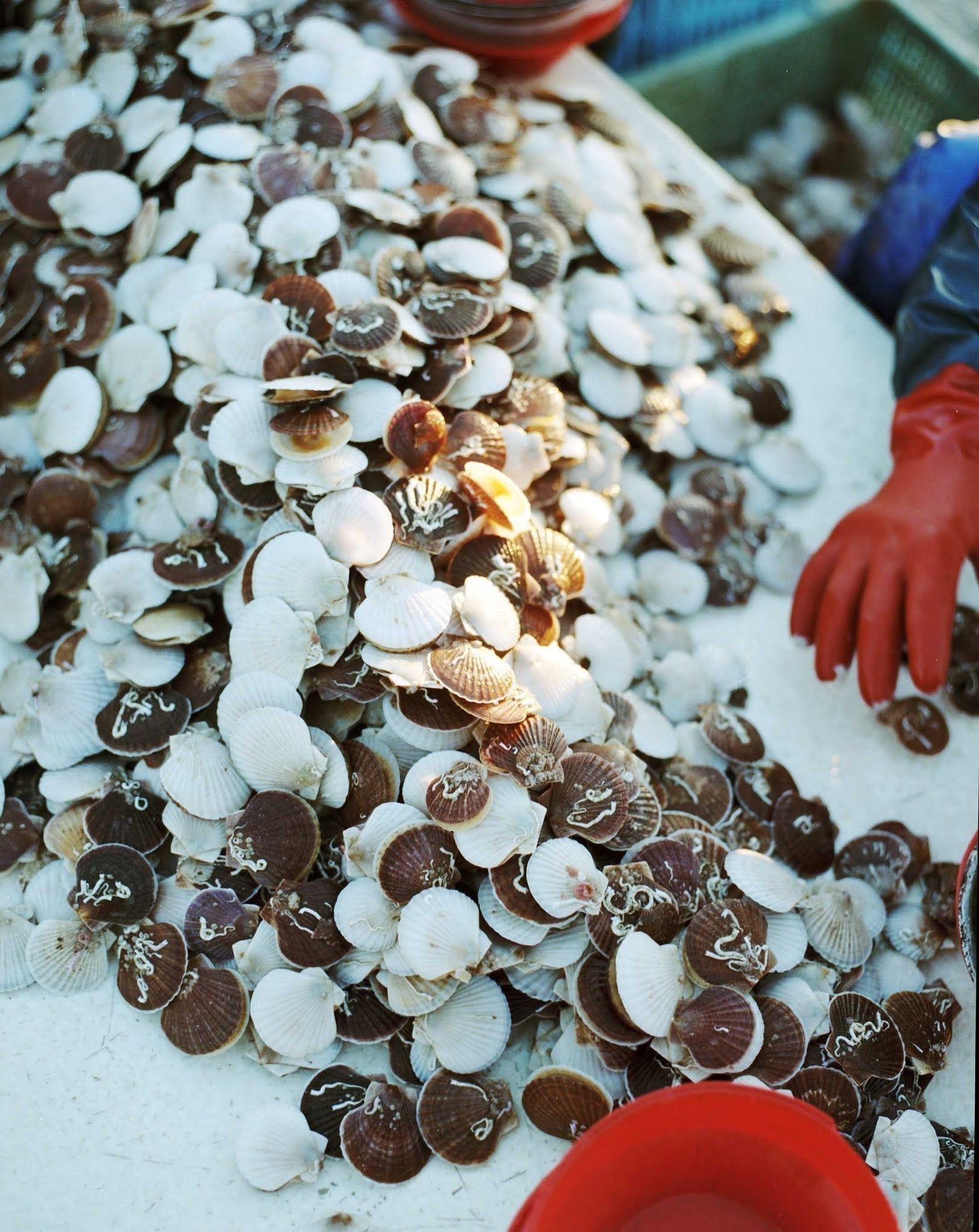 ▲ホタテの稚貝。沖合に吊るしたカゴで約2年間育てたのちに出荷される。出荷時には12センチ前後まで成長する