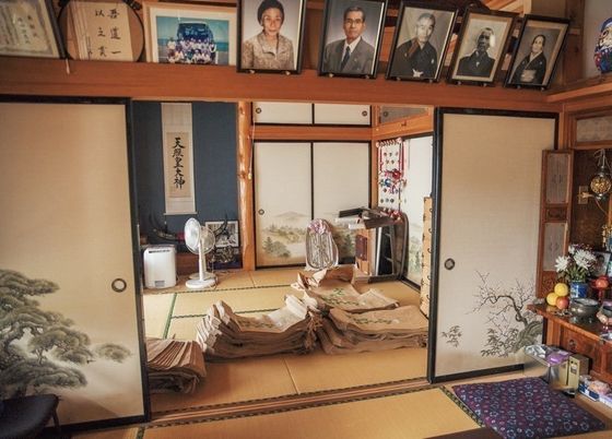 ▲米袋にラベルを貼りスタンプを押す作業は仏間で。鴨居には先祖代々の写真