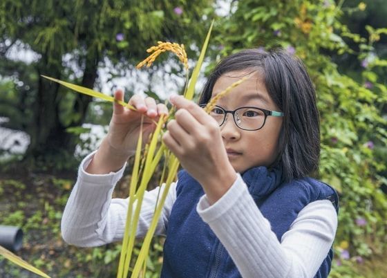 ▲二女の陽葵(ひまり)ちゃんは田んぼが大好きで、庭で稲を育てる「。コメ作りの後継ぎになってくれたらいいな」と美智子さん