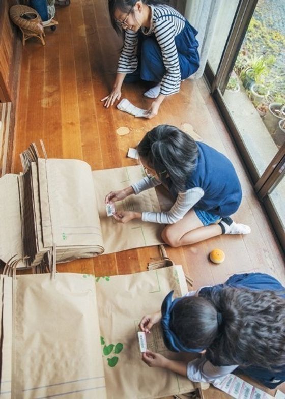 ▲「全量全袋検査済」のラベルを貼り、生産者名と品種を示すスタンプを押すのは美智子さんと娘3人の仕事