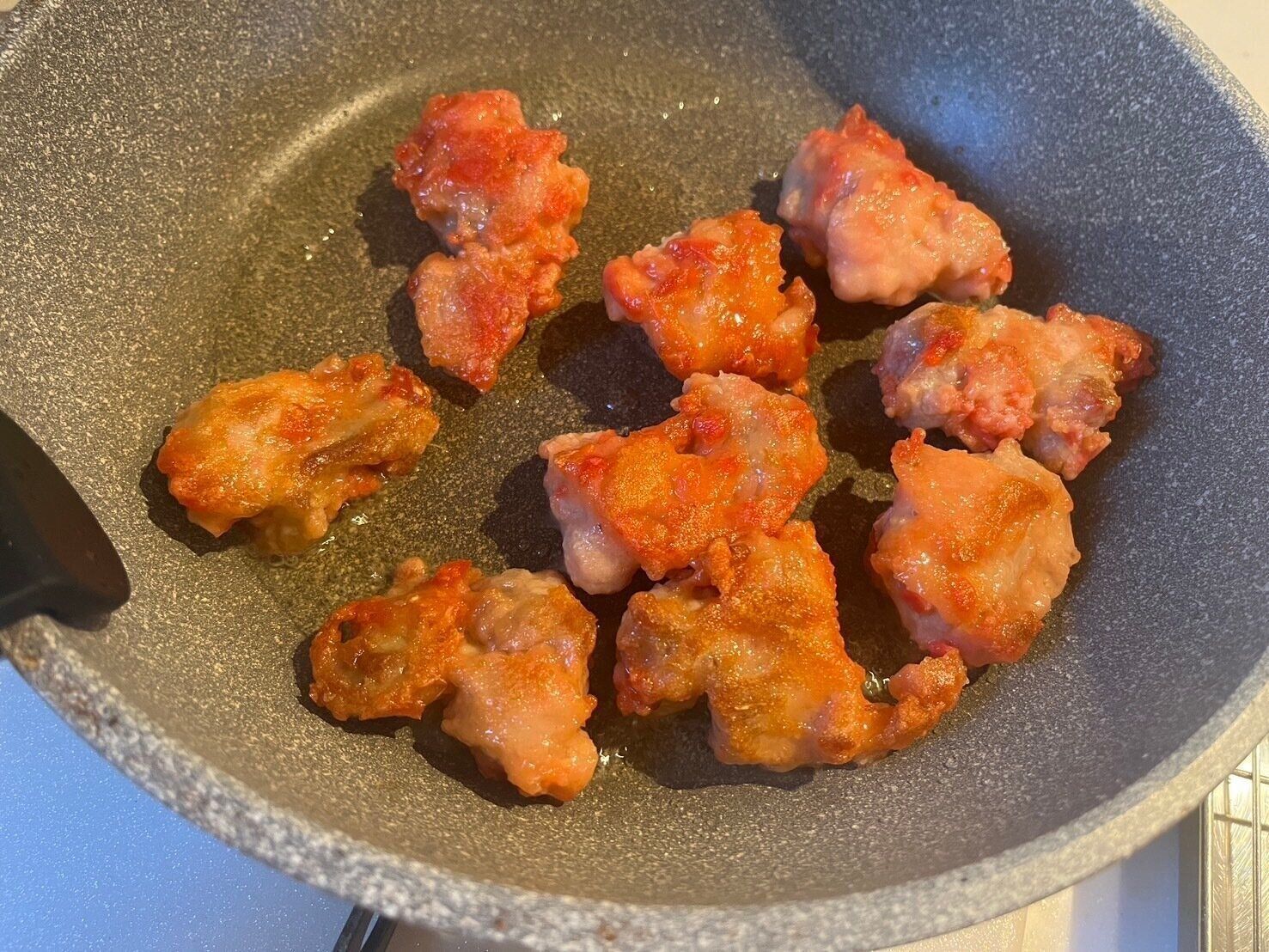 フライパンに少量の油を引いて、凍ったままのからあげを入れて揚げ焼きしていきます。
