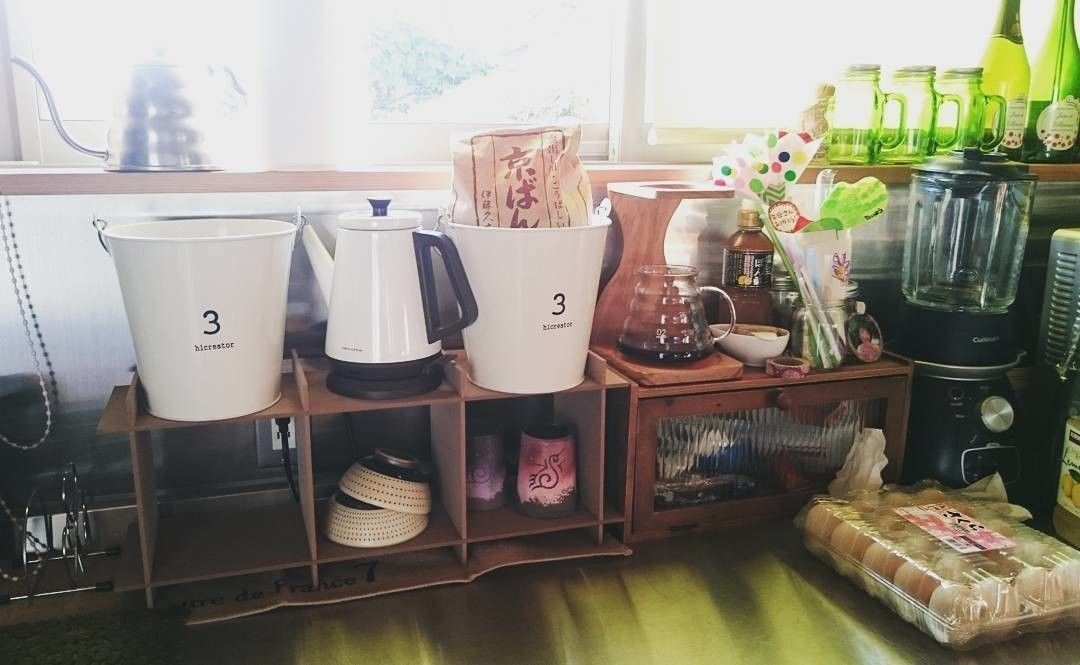 tanecco_emily_sun さんはキッチンの棚として使っています。調味料や食器、ケトルなど見せる収納ができるのもセリアのシンプルなパズルボードでこそ!