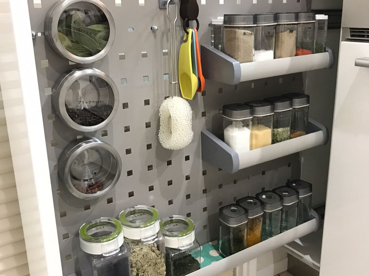 yukitan_homeさんはIH下の引き出しにニトリの調味料ストッカーを。蓋の工夫が使いやすくさすがお値段以上です。マグネット付きのケースにはローリエなどのスパイスを。