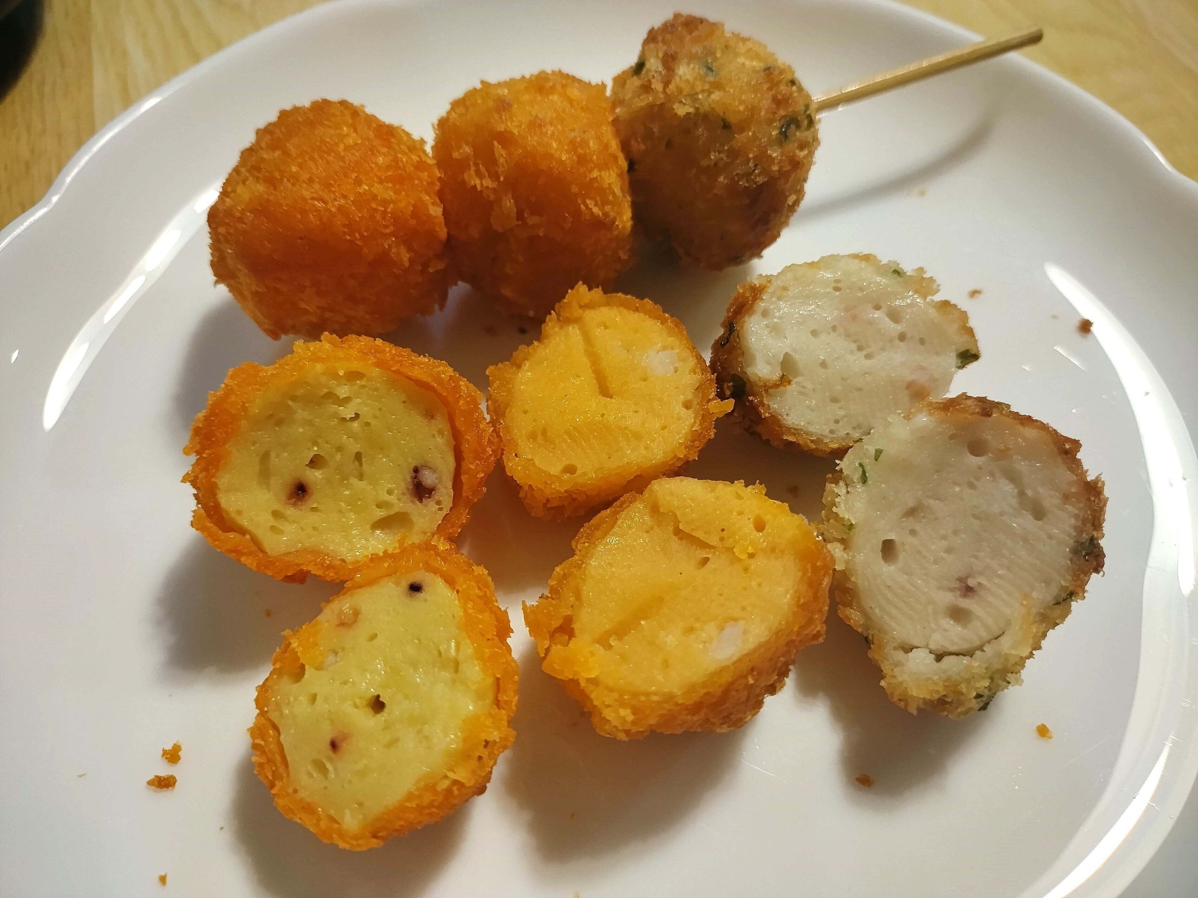 たこ、えび、いかを使用したまん丸のすり身に衣がつけられています。たこと南瓜がすり身に入ったたこ南京団子、えびすり身団子、いか磯辺団子(イカ下足+すり身)の3種類のすり身団子です。