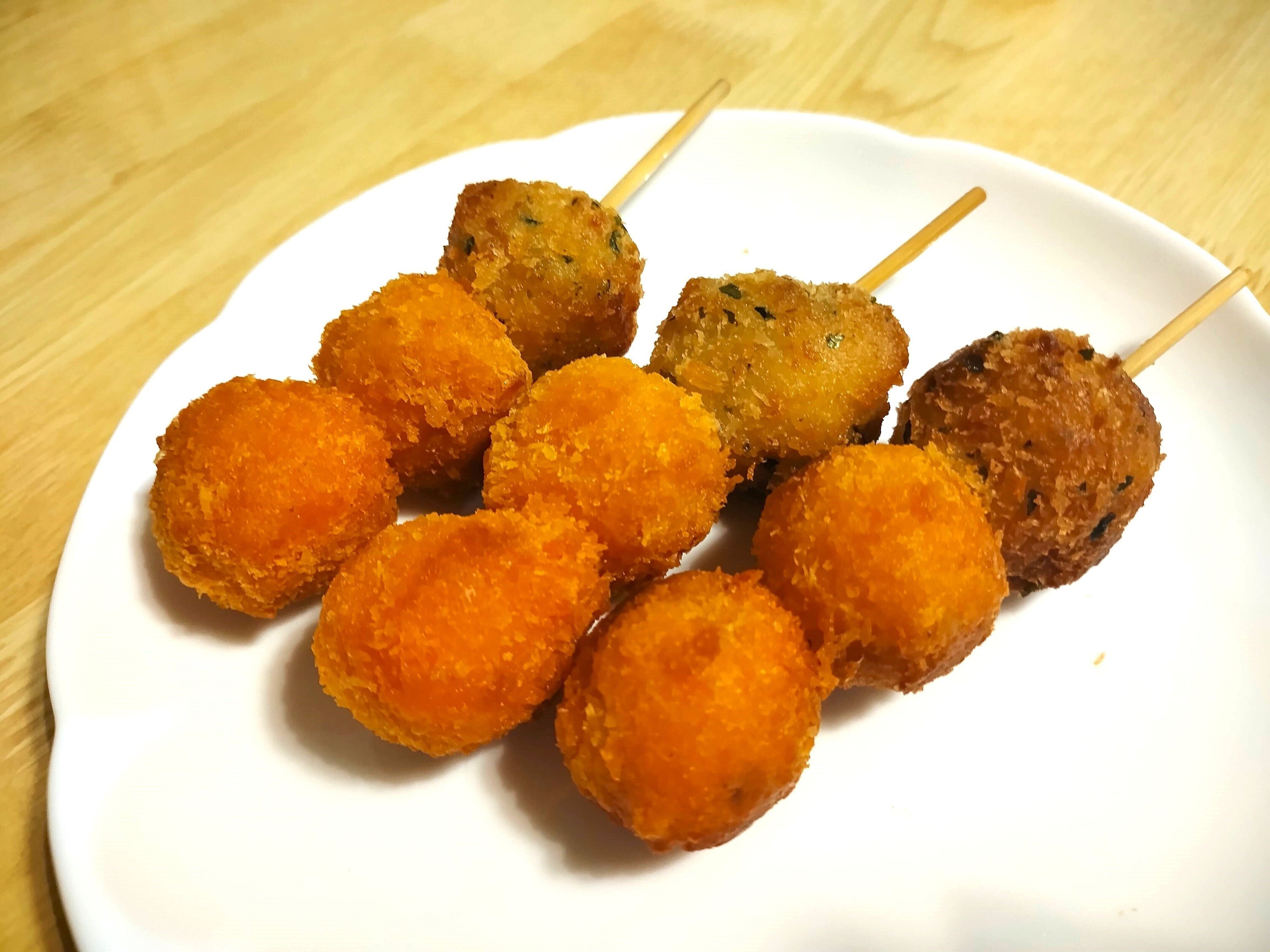 海鮮の味がおいしい串揚げです。オレンジ色はかぼちゃが入っているためのようです。彩りが良いのでお弁当にもよさそうですね。