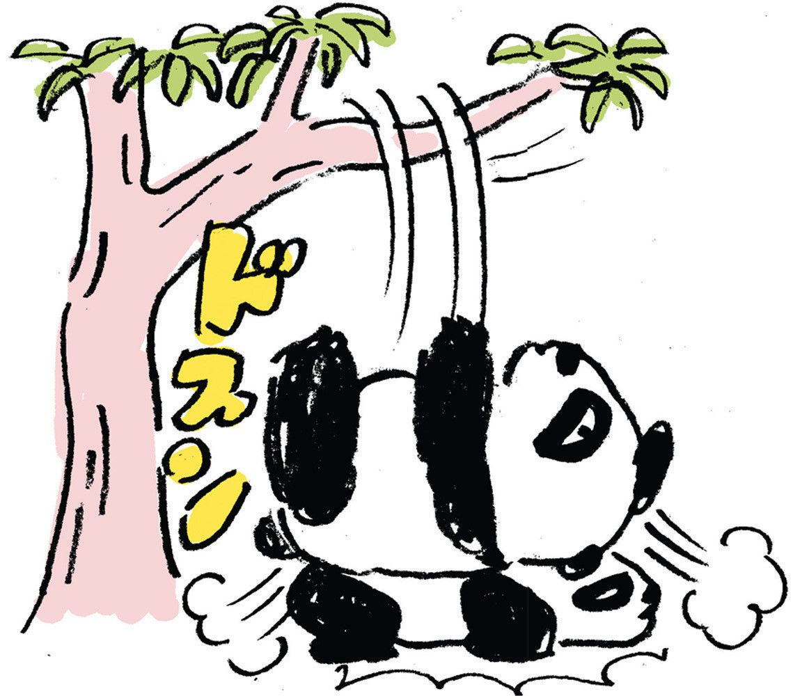 遊びや天敵から逃げるときなどに、よく木に登るパンダ。「対して下りるのは苦手で、体も重いからよく落っこちちゃう。でも、クマ科の動物で頑丈なのでどうってことない。落ちるほうが下りるより、手っ取り早いのかもね」