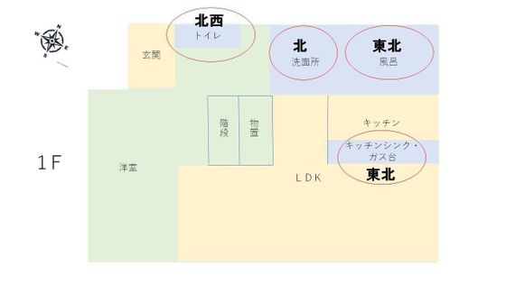 さて、あなたの家の間取りを見えると、1階の北西から北、東北にかけて、「北」がつく方位に、トイレ、洗面所、お風呂場と水場になっている。「北」という方位は男女の愛情運を育むところなのに、そこに水場=ダメージがあるということは、この家には愛情運がないということなんだね。
