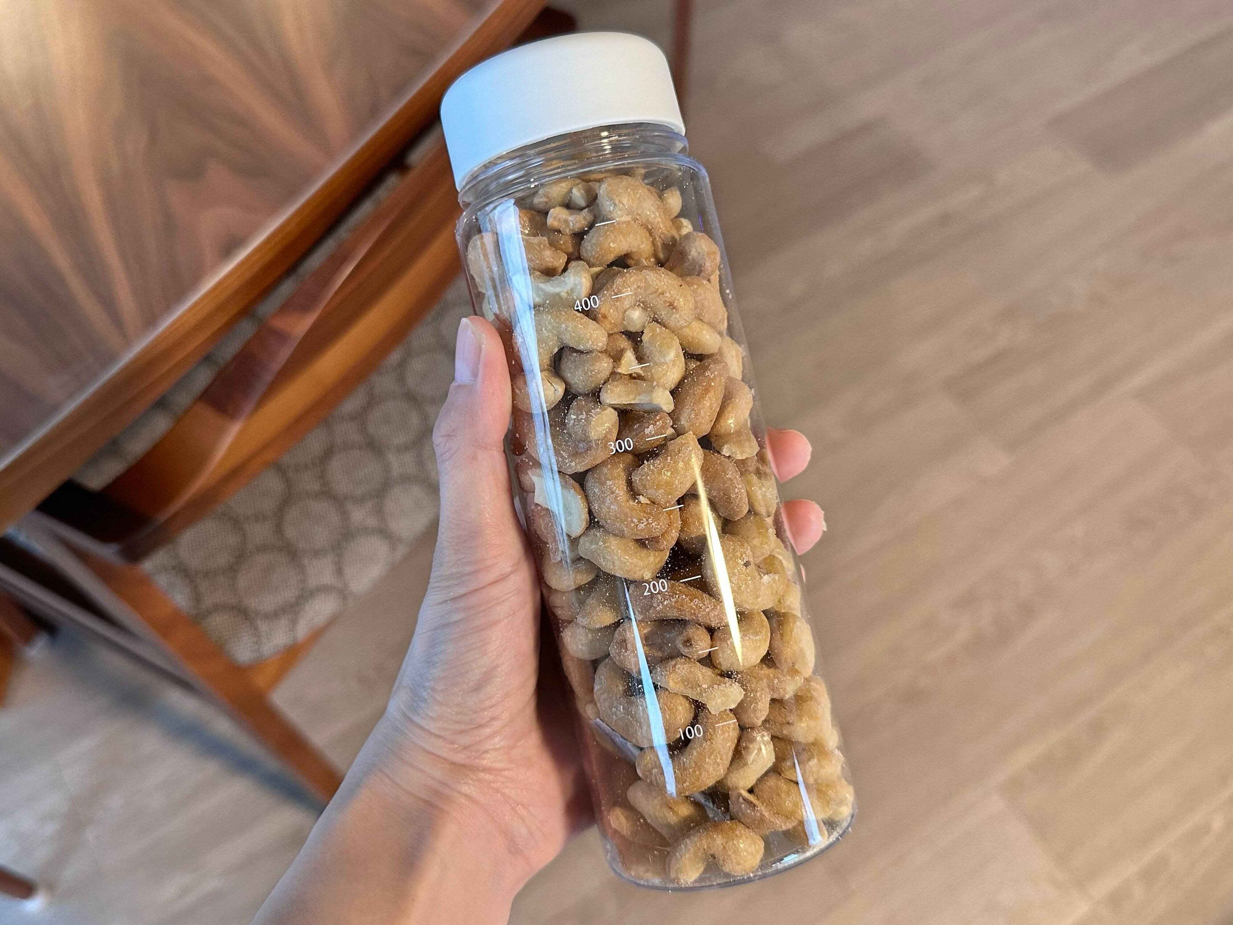 このドリンクボトル、飲み物を入れるのはもちろんなのですが、ナッツなどの保管にもすごく便利なんです!ジッパーバッグに入っているナッツ、毎回ジッパーを開閉するのがちょっと面倒だと思ったことありませんか?しっかりと閉まっていなくて失敗することも…。このドリンクボトルに入れ替えると、しっかりと密閉されますし立てて収納しておくこともできるので、見た目もすっきりします。