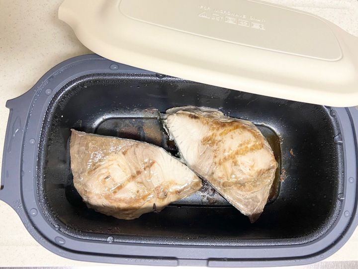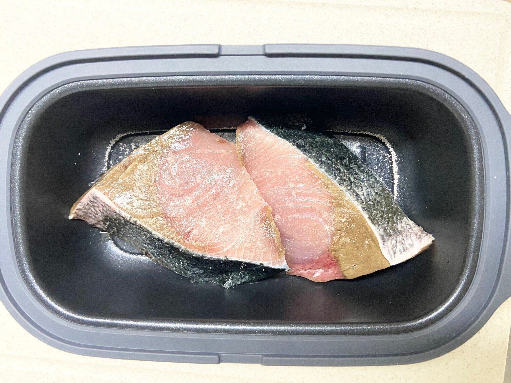 ぶりの切り身を使って「ぶりの塩焼き」を作ってみることに。本体は、1~2人前のお料理を作るのにちょうどいいサイズ感です。まず、塩を適量まぶしたぶりを2切れセットします。