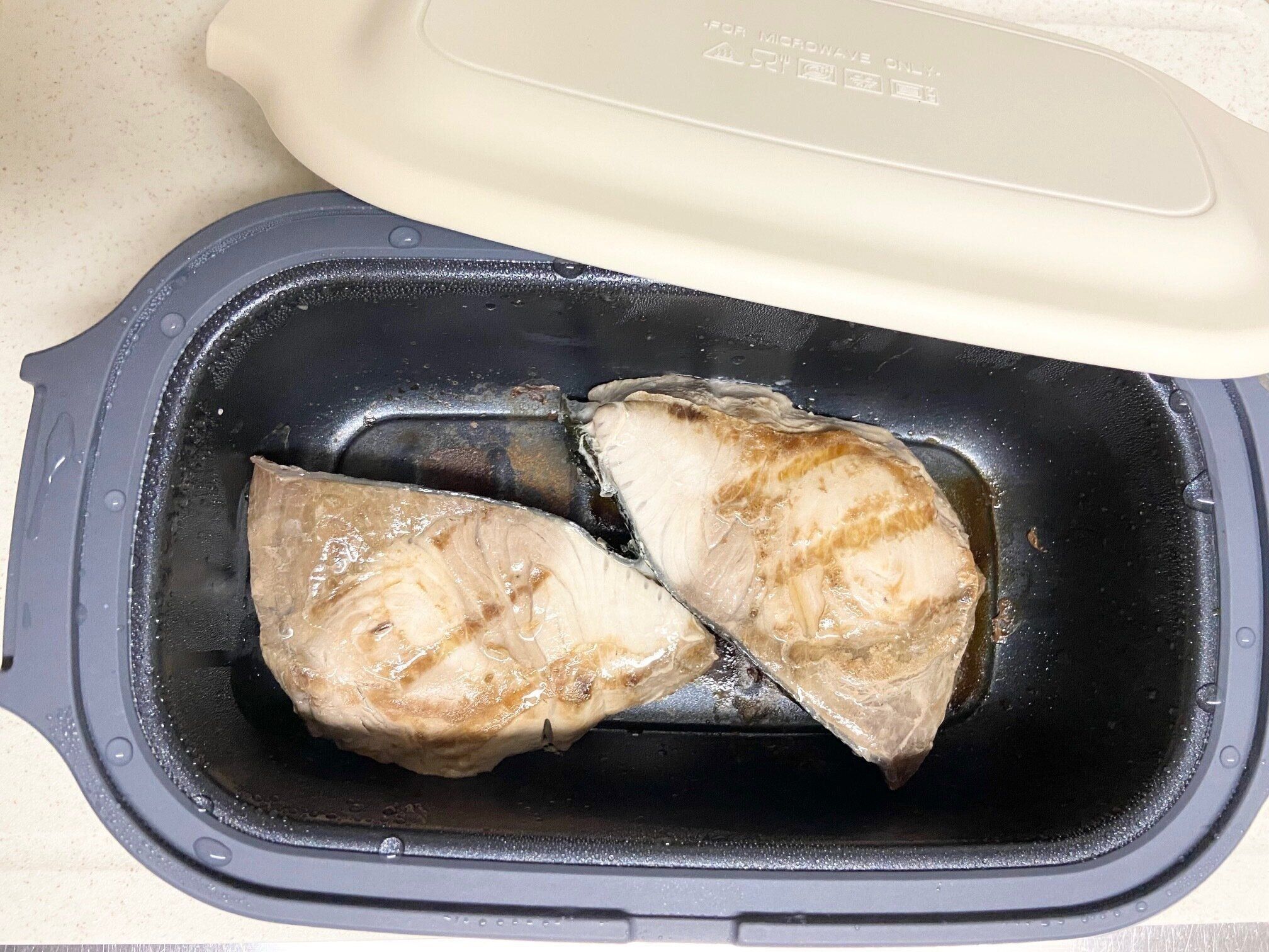 蓋をして電子レンジ600Wで3分ほど加熱します。3分経ったら一度本体を取り出し、中のぶりをひっくり返し蓋をしてまた600W2~3分加熱すれば完成です。6分あれば焼き魚が完成!