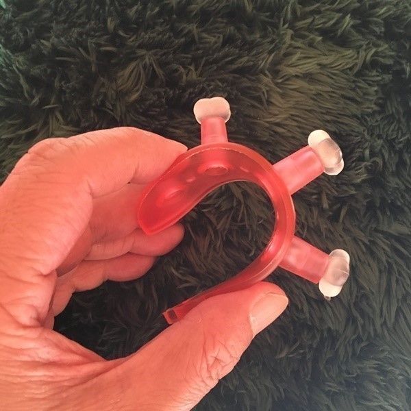使い方は、上の写真のように足指パットの突起に指をはさむだけ。塩化ビニール製で柔らかいのですが、慣れないうちは、小指からはめ込むと上手にはさめるでしょう。