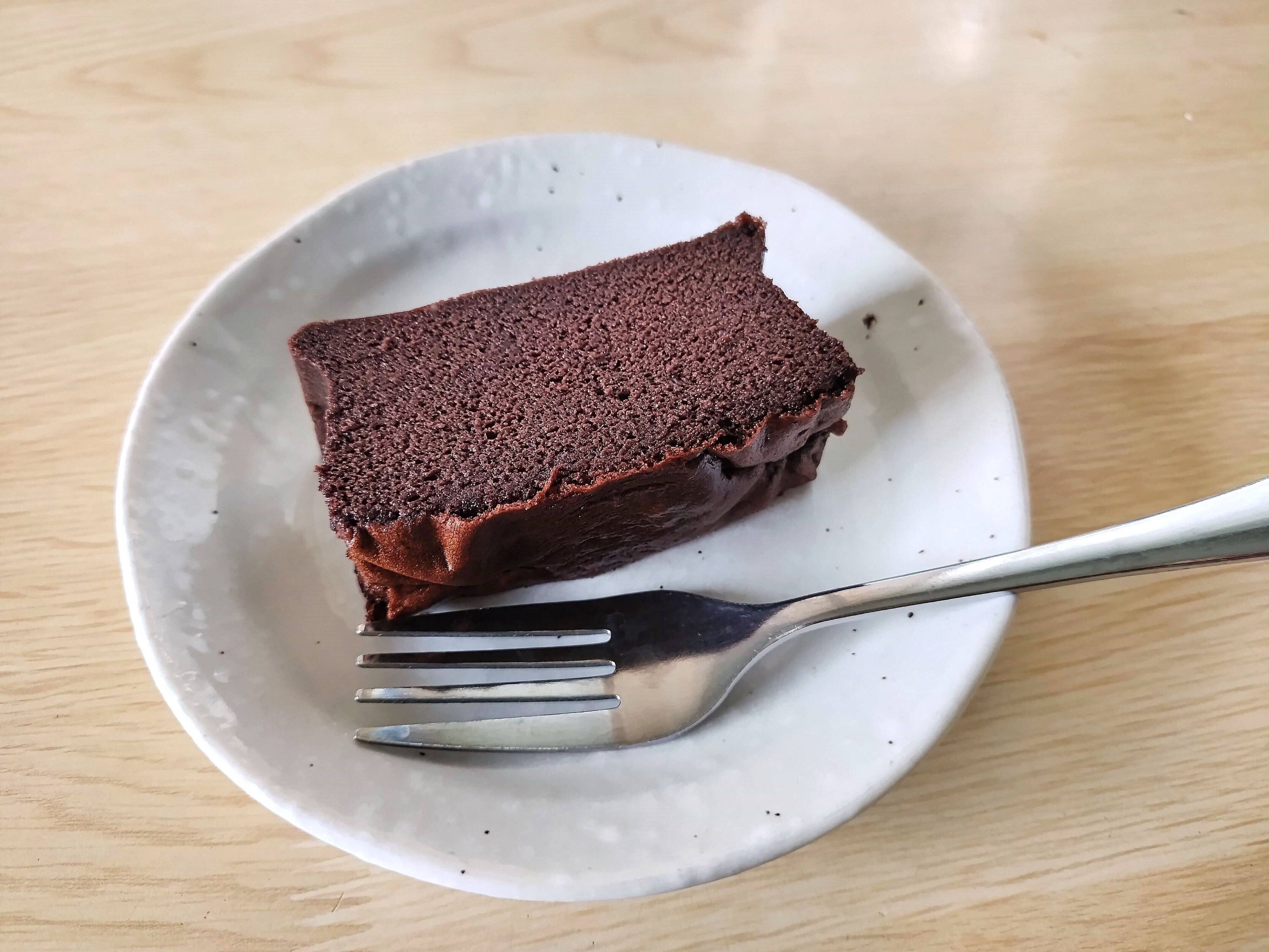 それでは早速いただきます。1口食べると、ふんわりした優しい甘さが口いっぱいに広がります。スフレチーズケーキと同様にほんのり卵の味がしますが、チーズの香りは控えめです。その代わり、チョコはしっかり感じます。チョコレート好きな3歳娘はパクパク食べていました。