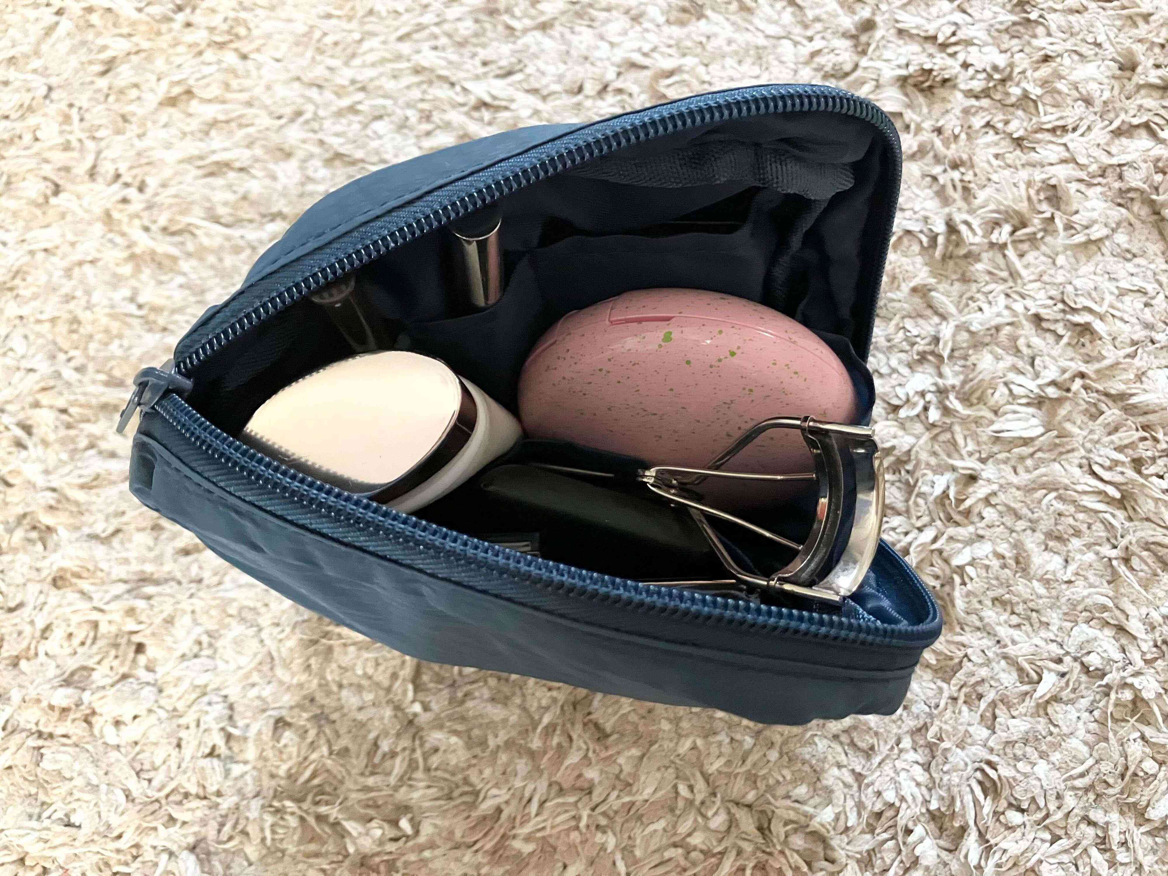 コスメグッズをポーチに入れる前は、この大きさでファンデやビューラーが収まるのかと心配だったのですがしっかり入りました!ただ、沢山入れることはできないので、旅行中、日によって違うメイクをするという量は入らない感じ。もちろんコスメの大きさにもよりますが、私のよく使用するものは無理だったので1セットを持っていく感じにしました。ちなみにメイクブラシは入リませんでした。