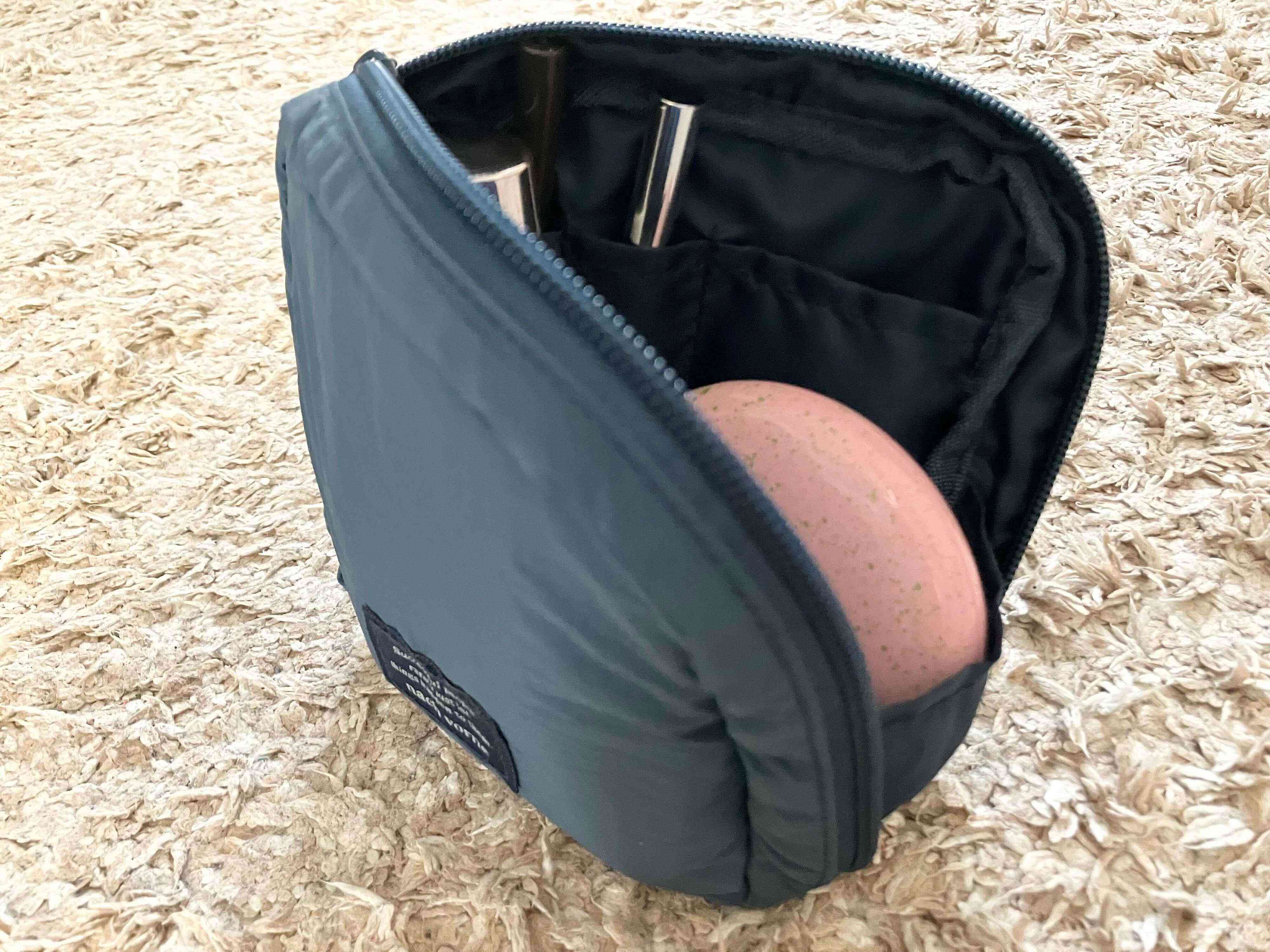 大きいものは左右のポケットに入らないので直接真ん中に入れたのですが、出てこない仕組みになっているんです。サイドに仕切りがあるので立てて置いた時に、そこがストッパーになってファンデが転がり落ちてくることを防いでくれました!スペースがあまりない場所でメイクをする時に、立てて置くことができるのは便利ですね。