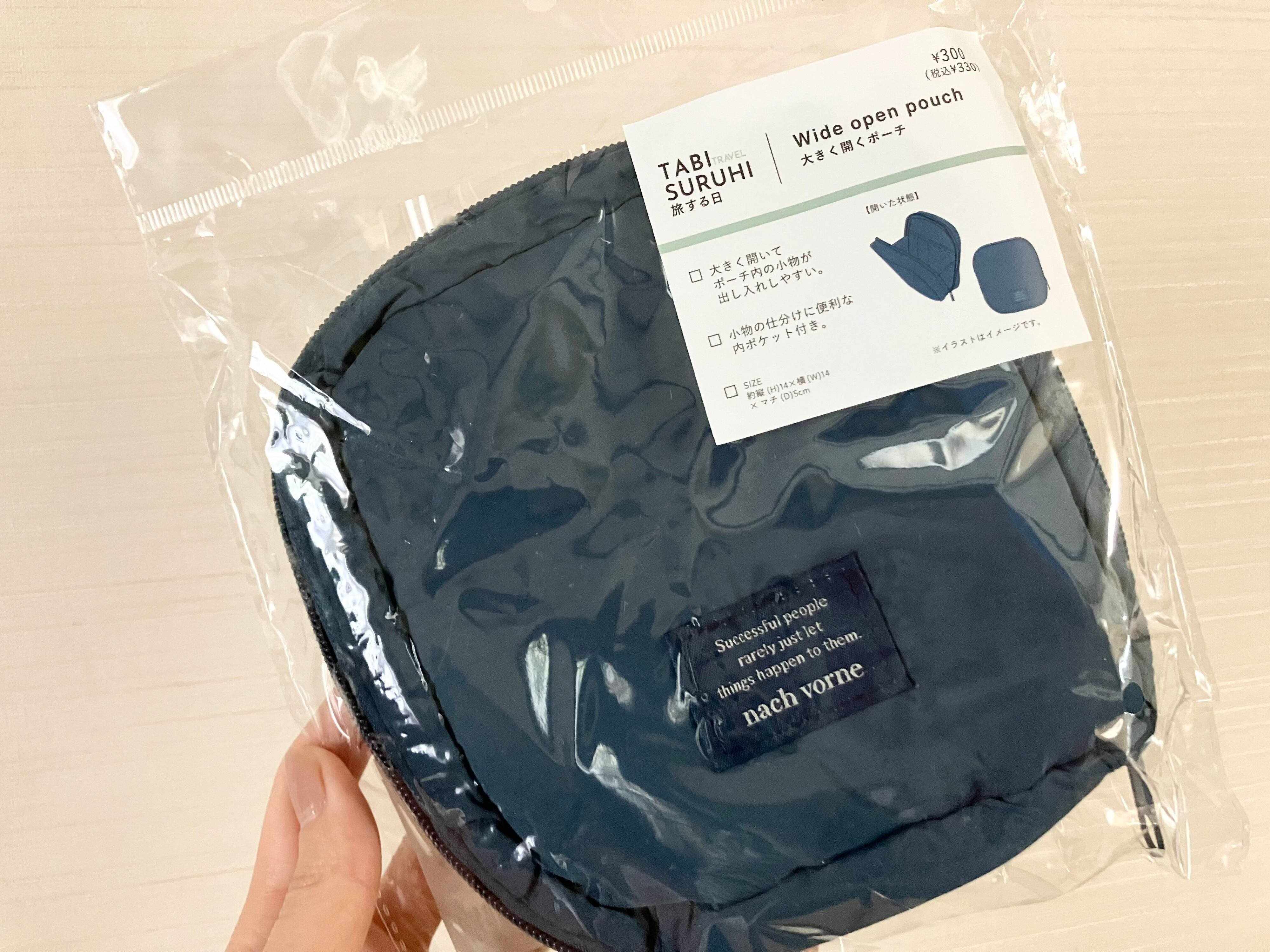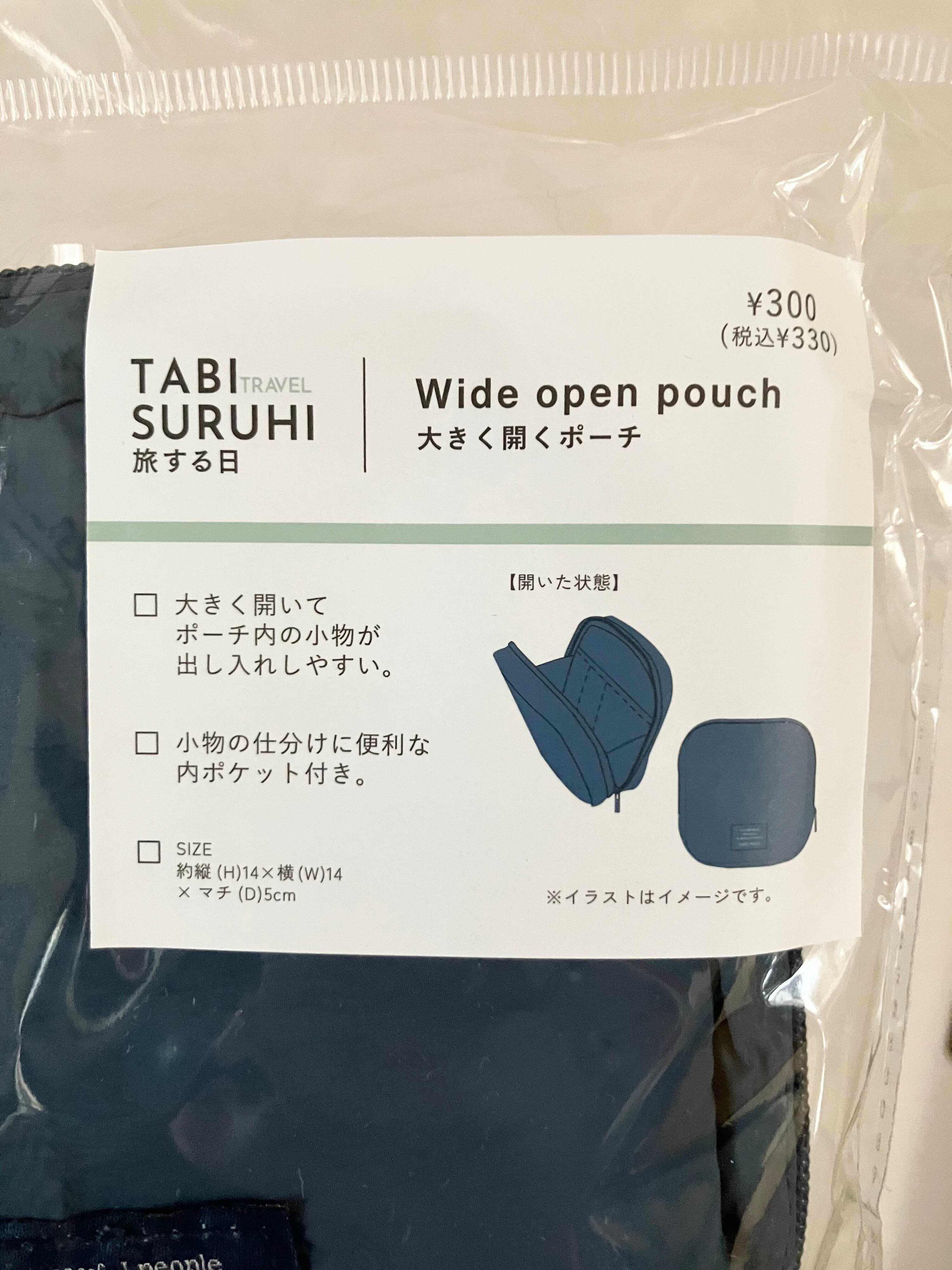 名前の通り口が大きく開くのでポーチに入れた小物が出し入れしやすい使用になっています。お値段は「330円」。キャンドュやダイソーのアイテムと値段は同じです。大きさは縦14cm×横14cm×マチ5cmなので、大きすぎ小さすぎずという感じですが、若干小降りのように見えるので、中身は沢山入るのかな?と思えます。