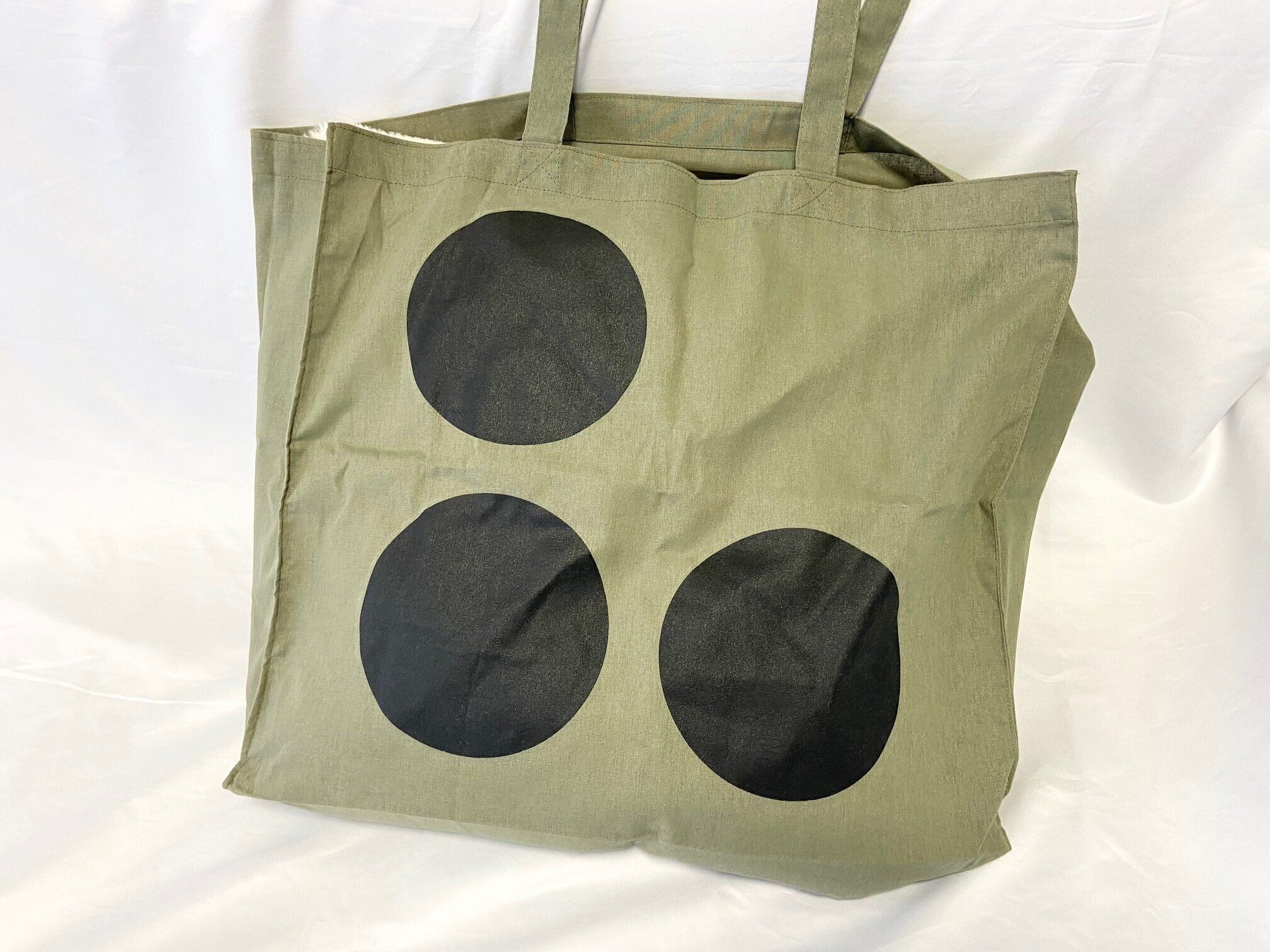 3COINS原宿本店のオープン時から販売されている原宿本店限定オリジナルトートバッグ。マニアなら知らない人はいない限定アイテムは、カーキにブラックの●がプリントされたシンプルなデザインで年齢問わず使用しやすいバッグです。筆者が持っているのはLサイズ(550円)。他にもSサイズ(330円)・Mサイズ(330円)のトートバッグと巾着(2枚セット 330円)が販売されています。
