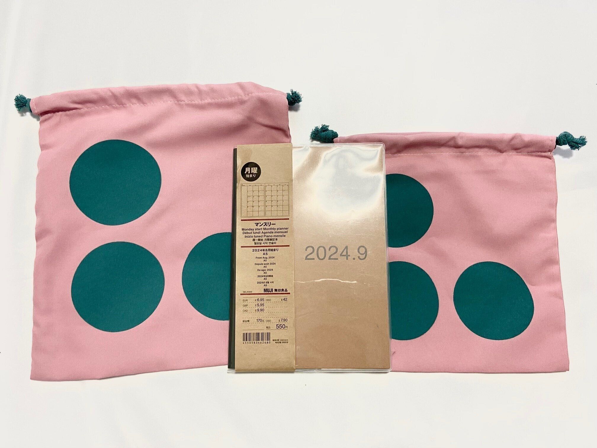 大きいサイズの巾着はA5サイズのノートを収納しても巾着のひもを縛ることができるくらいのサイズ感。小さい巾着はちょうどA5サイズくらいのサイズ感(ひもは縛れない)です。