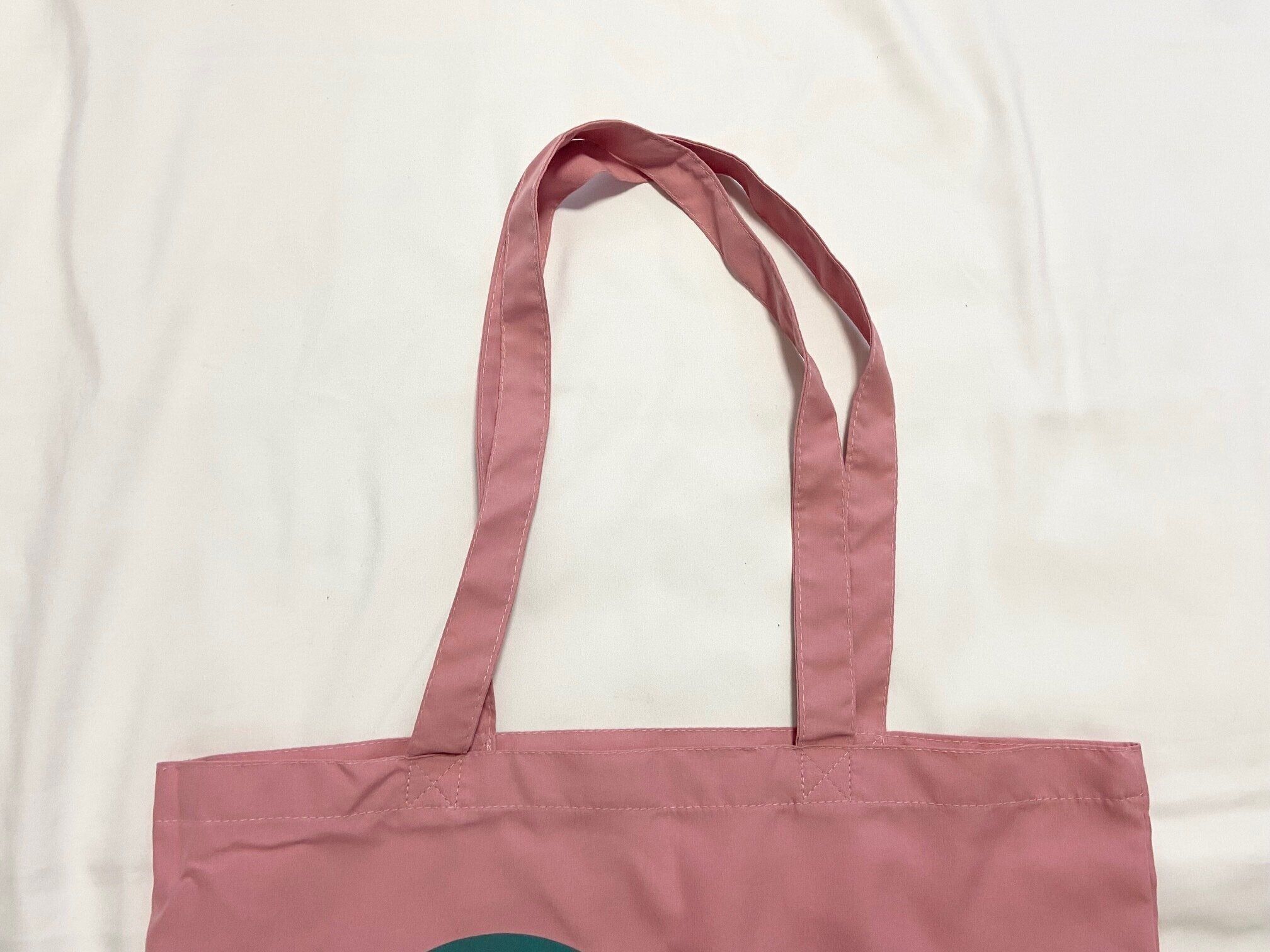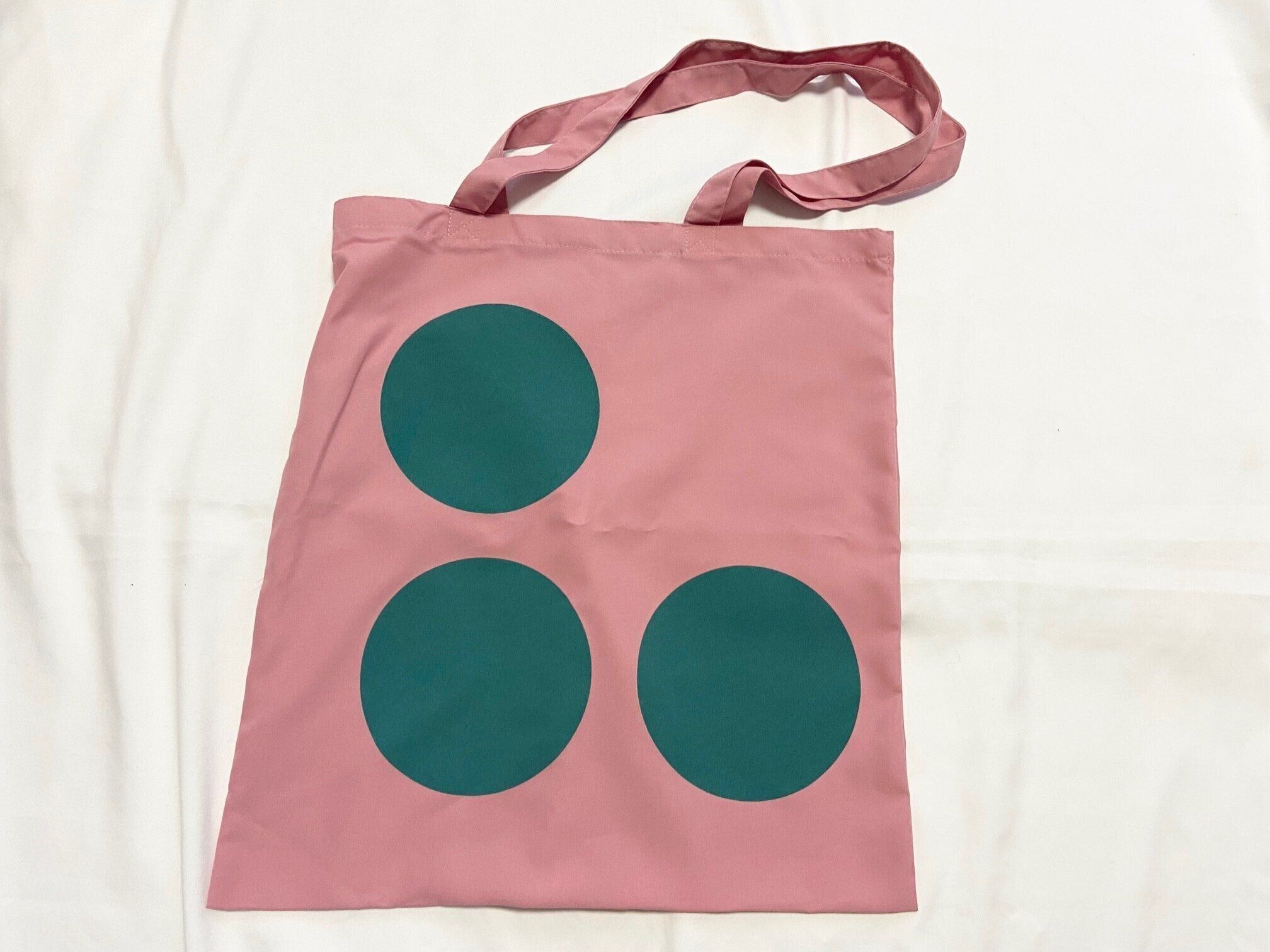 3COINS原宿本店限定トートバッグは不定期で限定カラーが登場! 2024年夏の限定カラーはピンク。サーモンピンクの生地にグリーンの●がプリントされたデザイン。同じデザインでもカラーが違うだけで印象が全然違いますよね。ラインナップはトートバッグSサイズ(330円)・Mサイズ(330円)・巾着(2枚セット 330円)です。