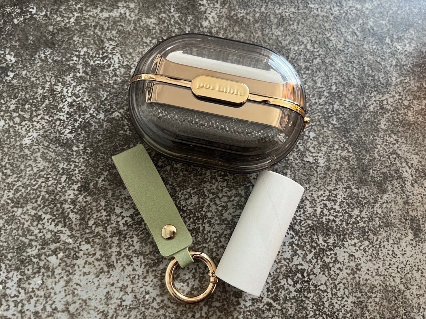 ストラップの色は本体のカラーによって異なり、私が購入したグレーには緑の、そしてアイボリーにはピンクのストラップがついていますよ。