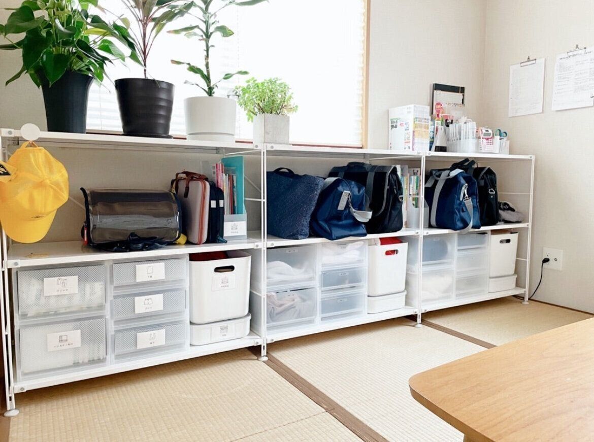 上の双子が中学校、下の長男が小学校に入学したのを機に、おもちゃ類は完全に和室から撤去して、子ども一人ずつに棚を準備して学校鞄・ランドセルや教科書・学校用品を収納する場所としました。