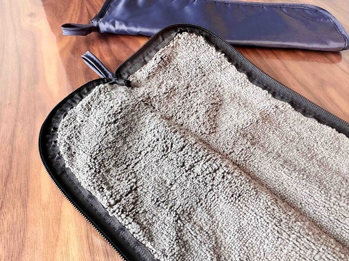 収納袋の内側がマイクロファイバー生地になっているので、水滴をしっかりと吸水してくれるようになっていますよ。