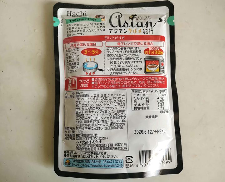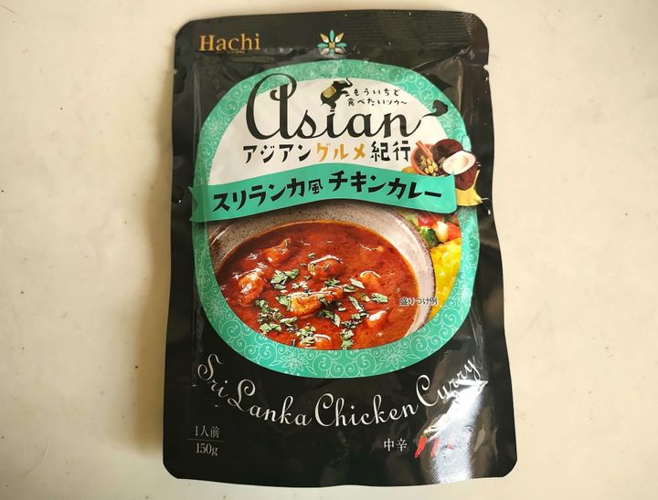 今回筆者が購入したのは、大阪にあるハチ食品の「アジアングルメ紀行スリランカ風チキンカレー」です。容量は150gと、1人分としてちょうどいい量です。一般的なレトルトカレーと同様に、お湯で温めるか、容器に移し替えて電子レンジで温めて食べることができます。