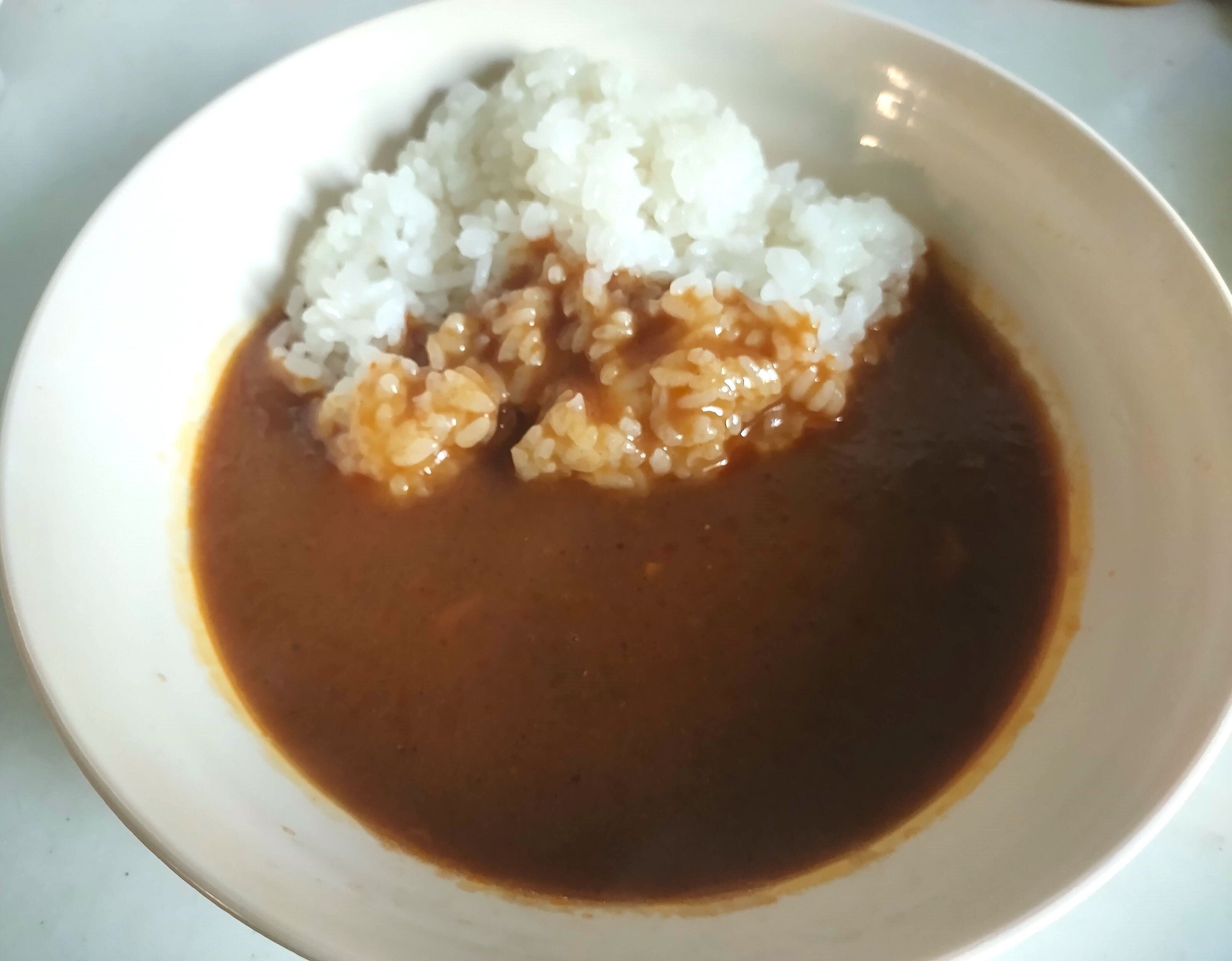 ルーの下の方に沈んでしまったため見えないのですが、メインの具材は鶏肉です。ご飯の上にかけてみると、水分が多くサラサラしています。ナンやチャパティといっしょに食べるより、ご飯といっしょのほうが食べやすいかもしれません。