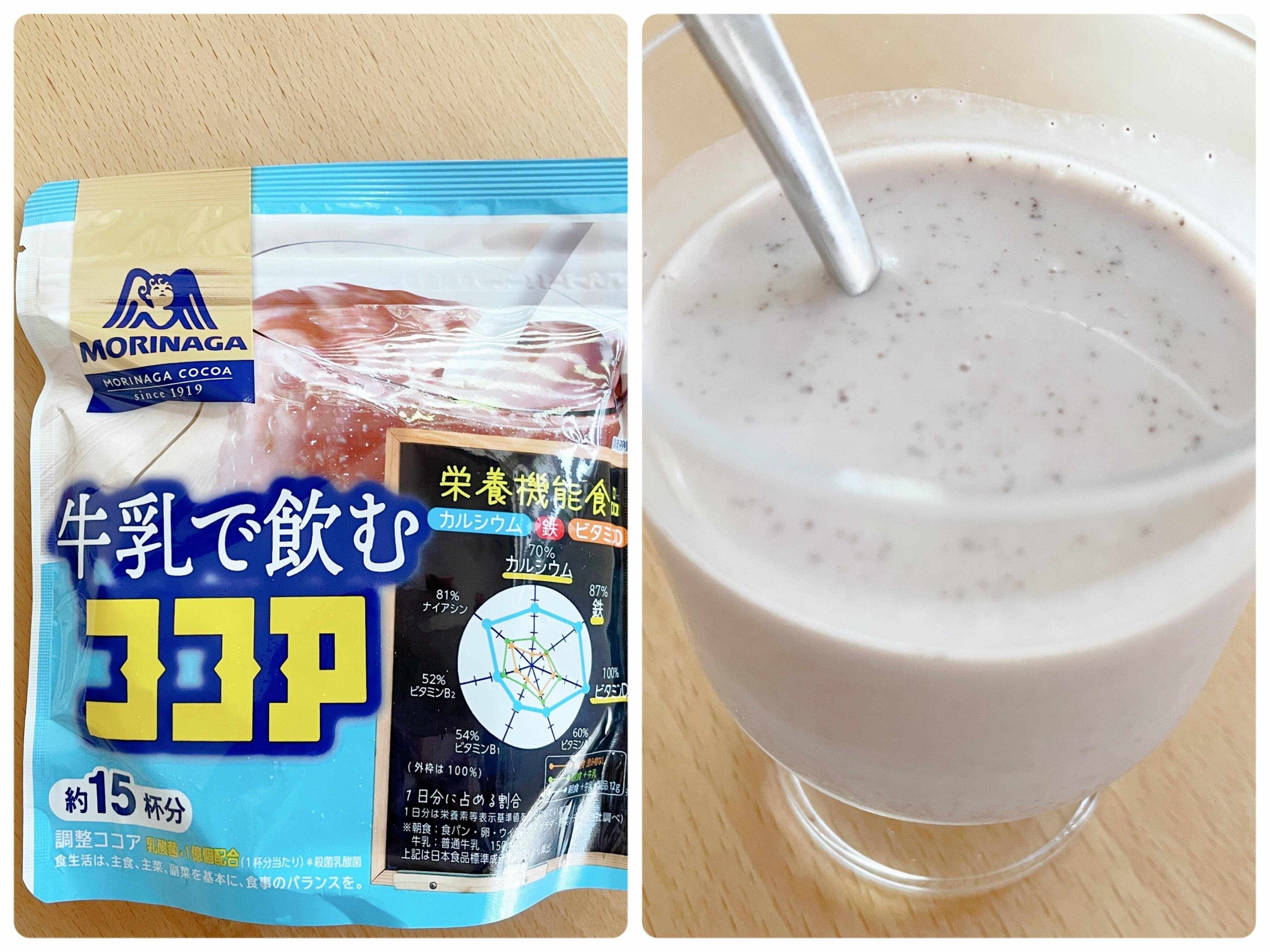 今回は栄養機能食品で、冷たい牛乳にサッと溶け、1杯でカルシウム・鉄・ビタミンDが1日の1/2量とれる「牛乳で飲むココア」を選択。バラバラで取り入れるのが面倒になったら、「フルグラ」に「牛乳で飲むココア」を混ぜて牛乳を入れれば1回で2つを取り入れられるので便利だと思ったのも取り入れる決め手になりました。