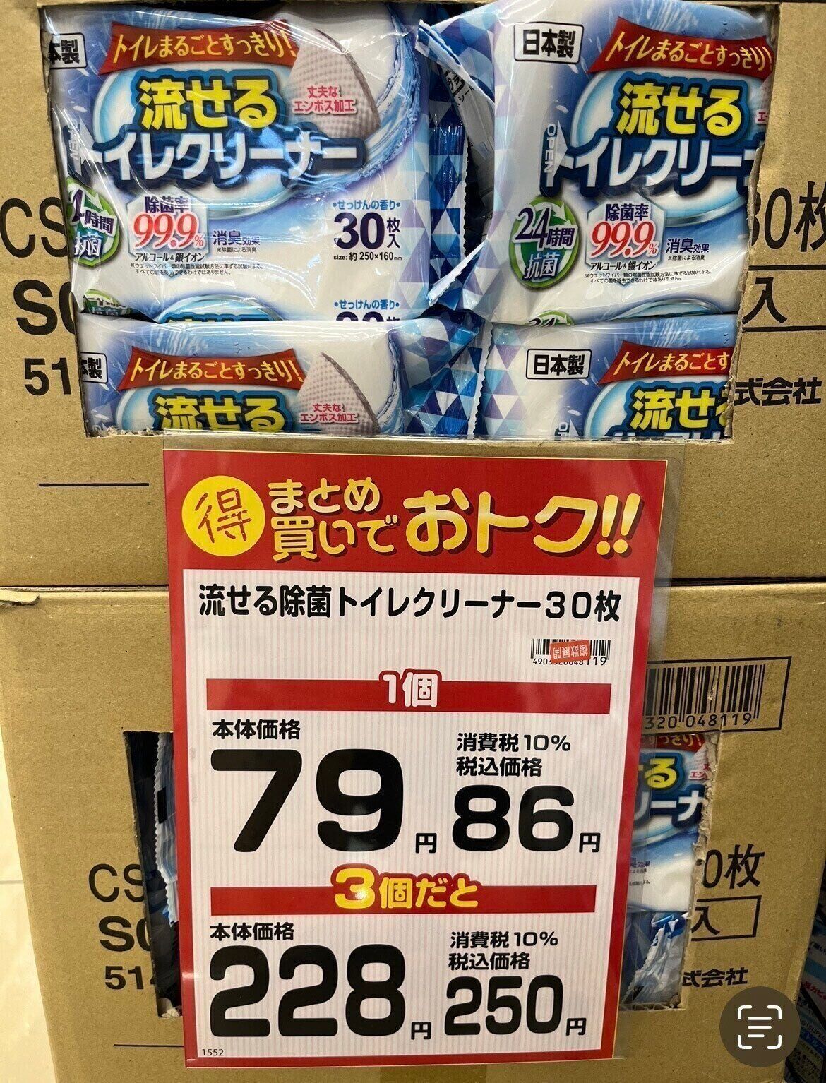 100均だと30枚入りで税込110円ですが、ドラッグストアだと同じ枚数でも税込86円、3個だと税込250円と100均よりお得!