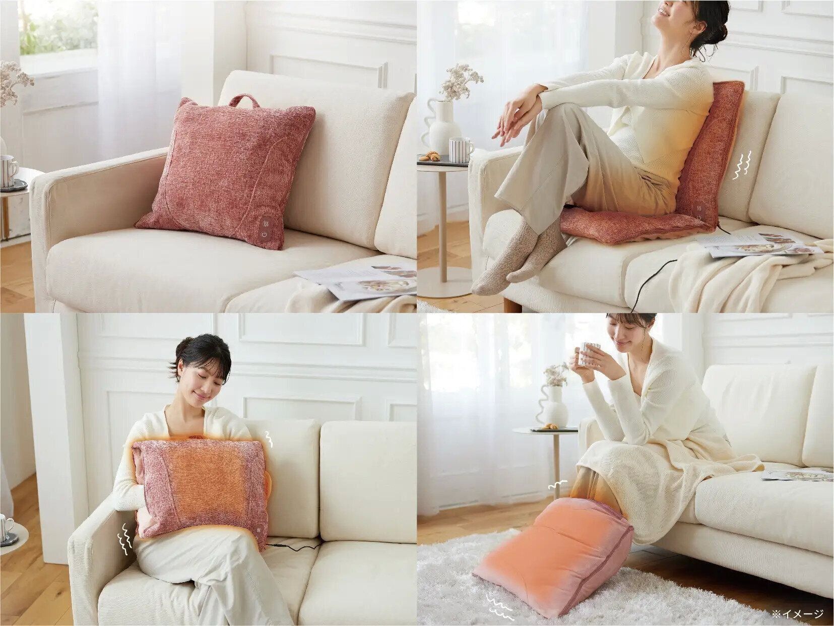 体の冷えを感じやすかったり、手先や足先が冷たいという悩みは多いもの。クッションとして背中を温めて使うだけでなく、ファスナーを広げて背中と腰や太ももを温めたり、手や足を中に入れて温めたりと自在に活用できるので、お気に入りの使い方をみつけて自宅やオフィスでリラックスしながら気軽に温活ができるのは嬉しいですね。